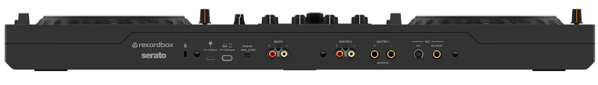 - Outputs: 1 Master (RCA), 1 Booth (RCA), 2 Headphones (6.3 mm and 3.5 mm stereo jacks)