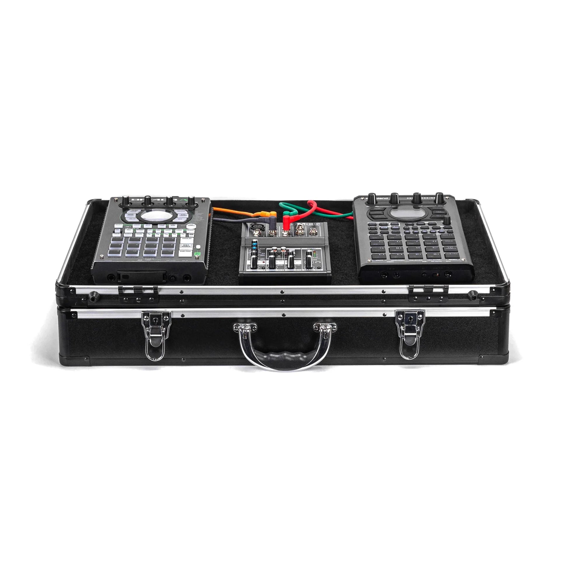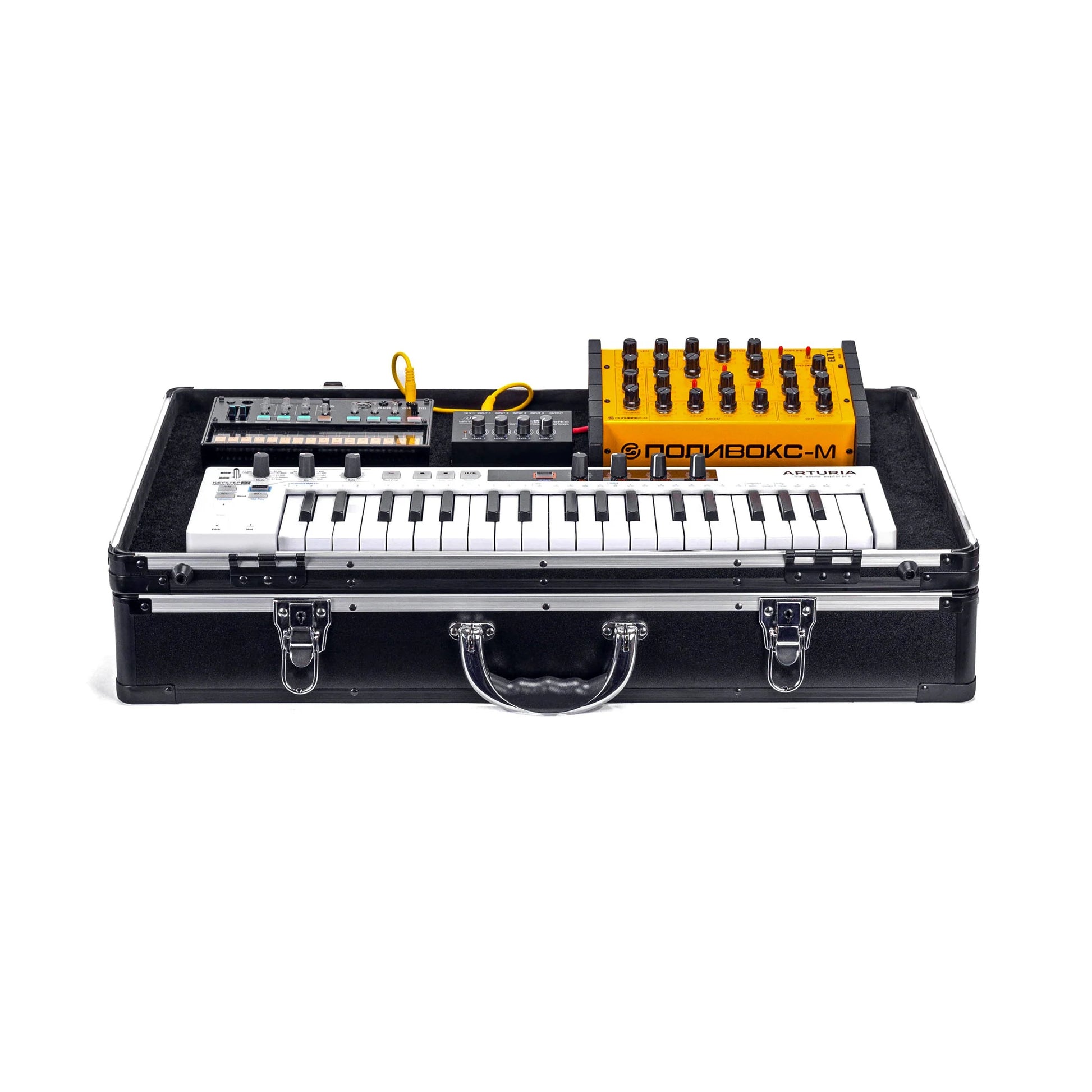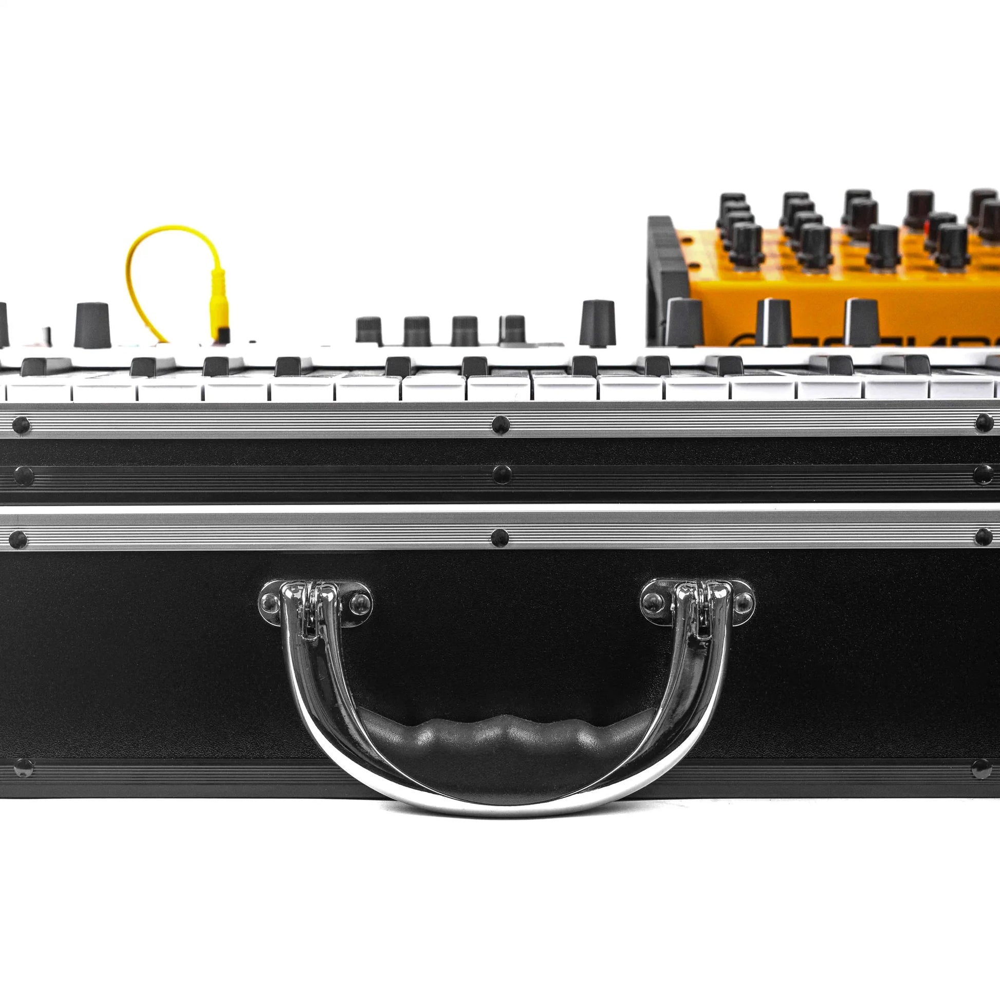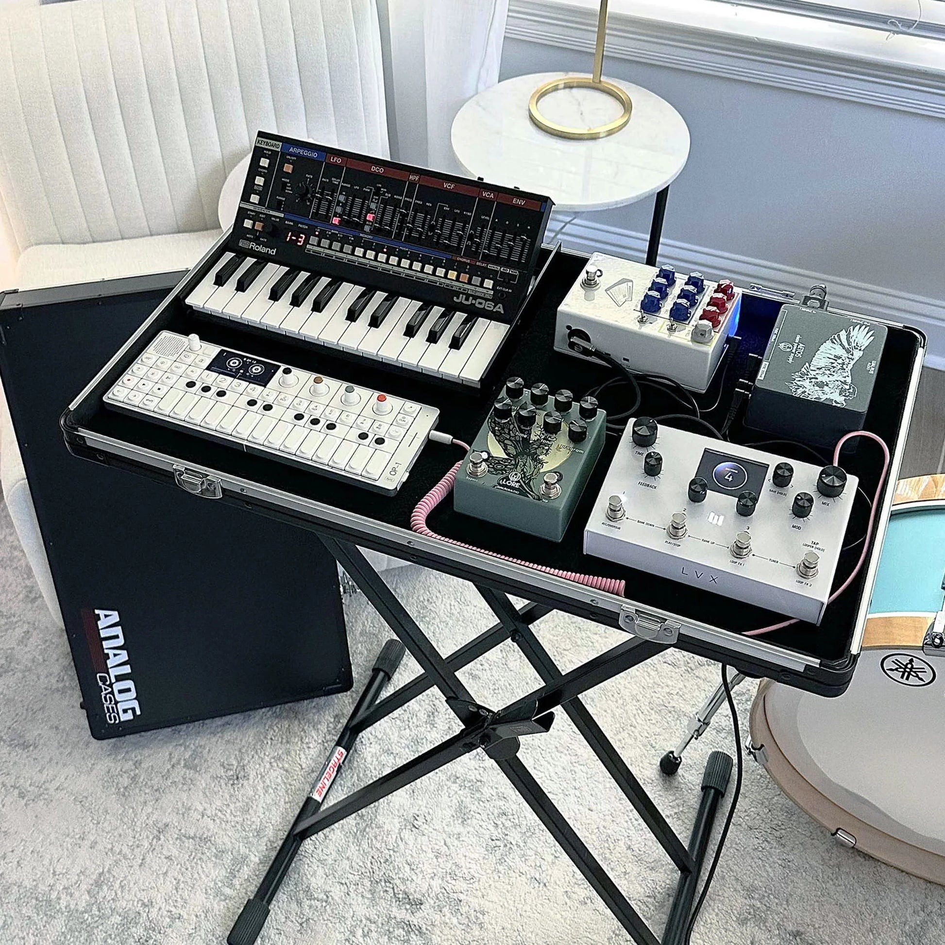 All your gear can be completely wired up while it’s in the case, just like a guitarist’s pedalboard. So when it’s time to perform, you just detach the removable lid, place it on a keyboard stand or table, and you’re ready to play.