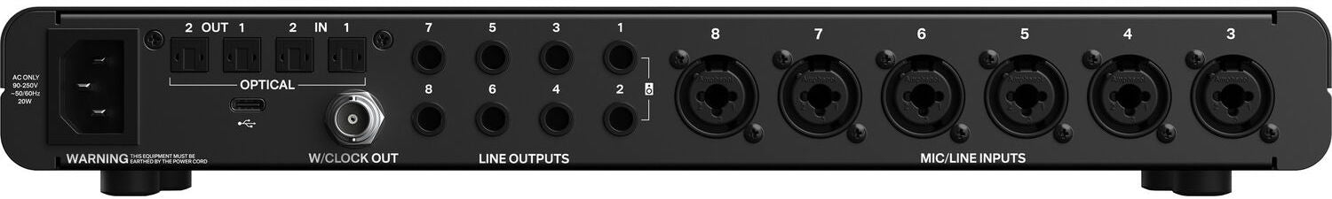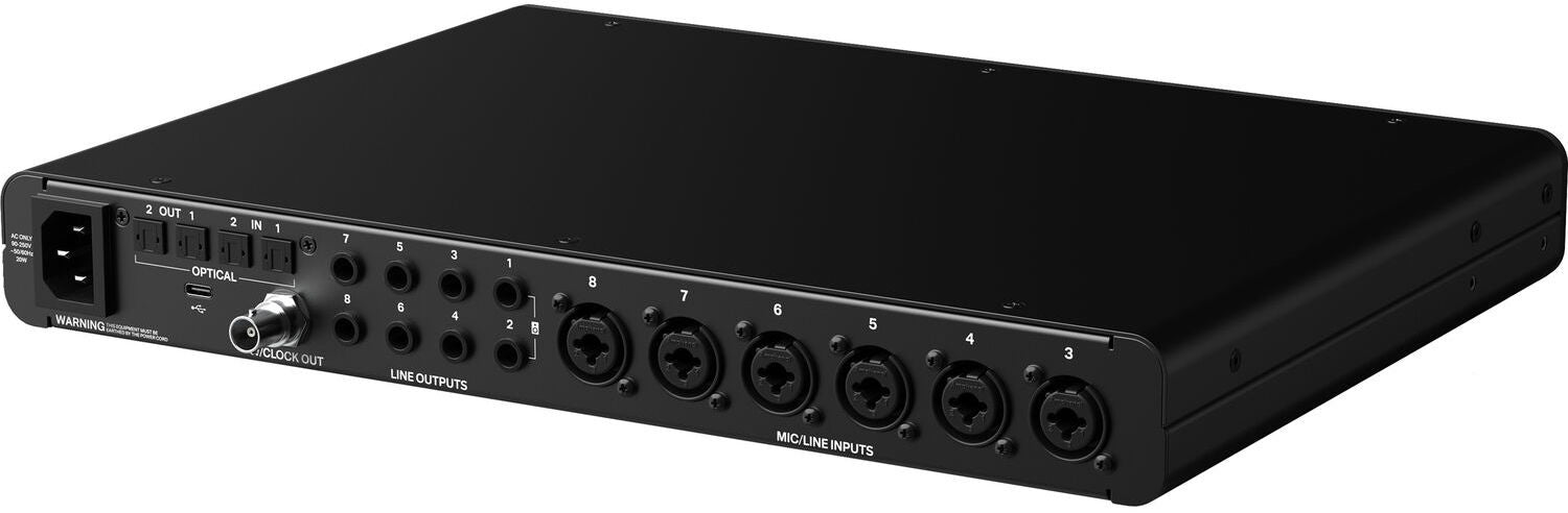 - Comprehensive I/O: 8 mic/line inputs, 2 JFET instrument inputs, 8 line outputs, 2 headphone outputs, ADAT/SPDIF I/O, and a Word Clock output