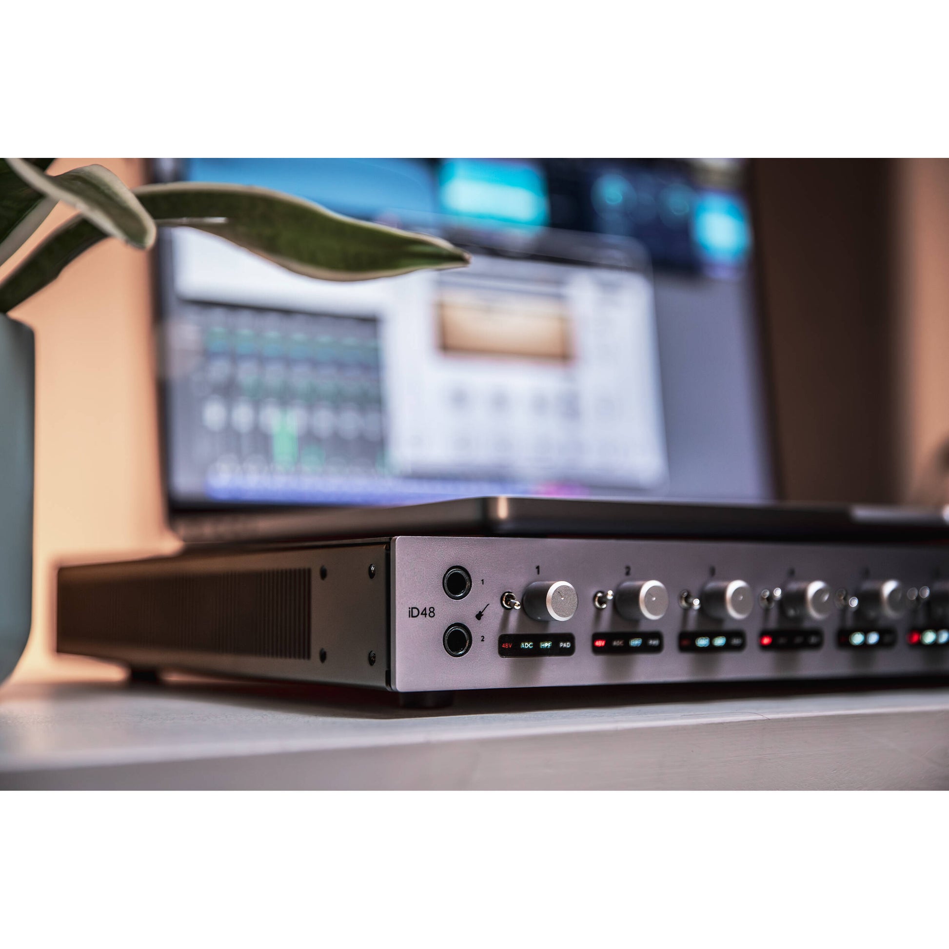 The iD48 brings pro-level audio quality and studio flexibility to your desktop. Easily expand later with ADAT, integrate external processors with the insert system, and manage everything from mixes to talkback with intuitive software—without compromise.