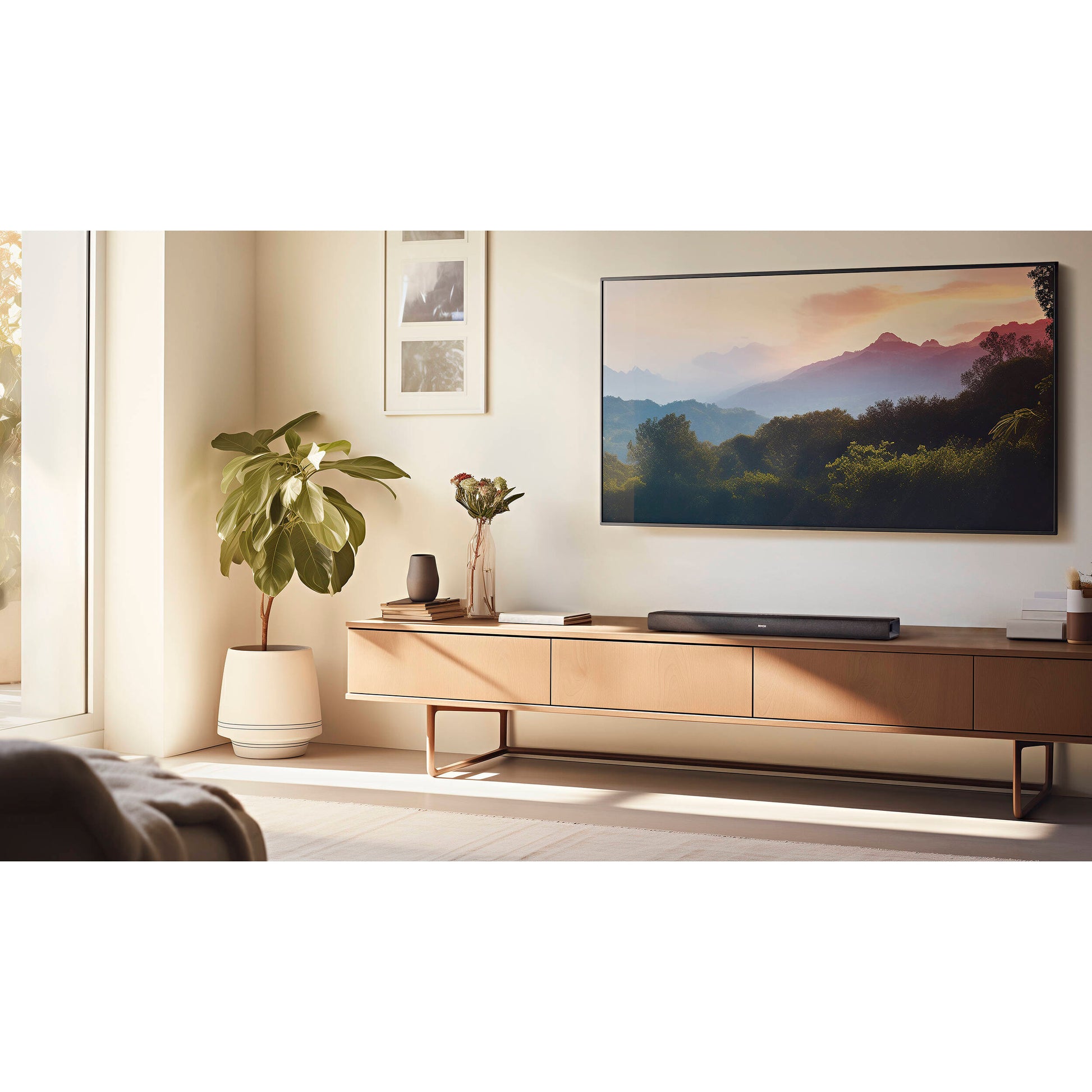 Connects easily to modern TVs via HDMI eARC or optical. Supports wall-mount or tabletop placement. Wirelessly integrates with phones and tablets via Bluetooth LE Audio.