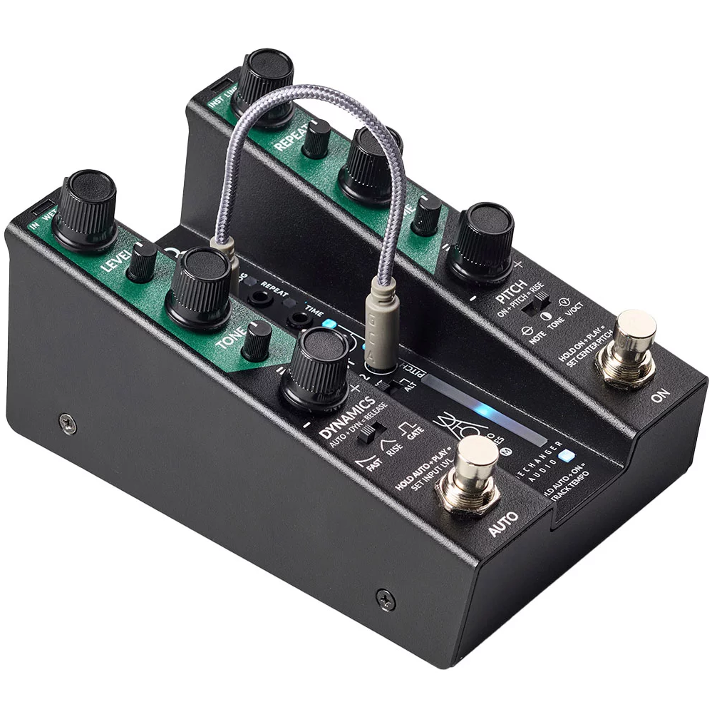 - Dynamic controls with attenuators: Four main knobs—Level, Time, Repeat, Tone—each paired with a smaller knob to shape modulation via dynamics and pitch