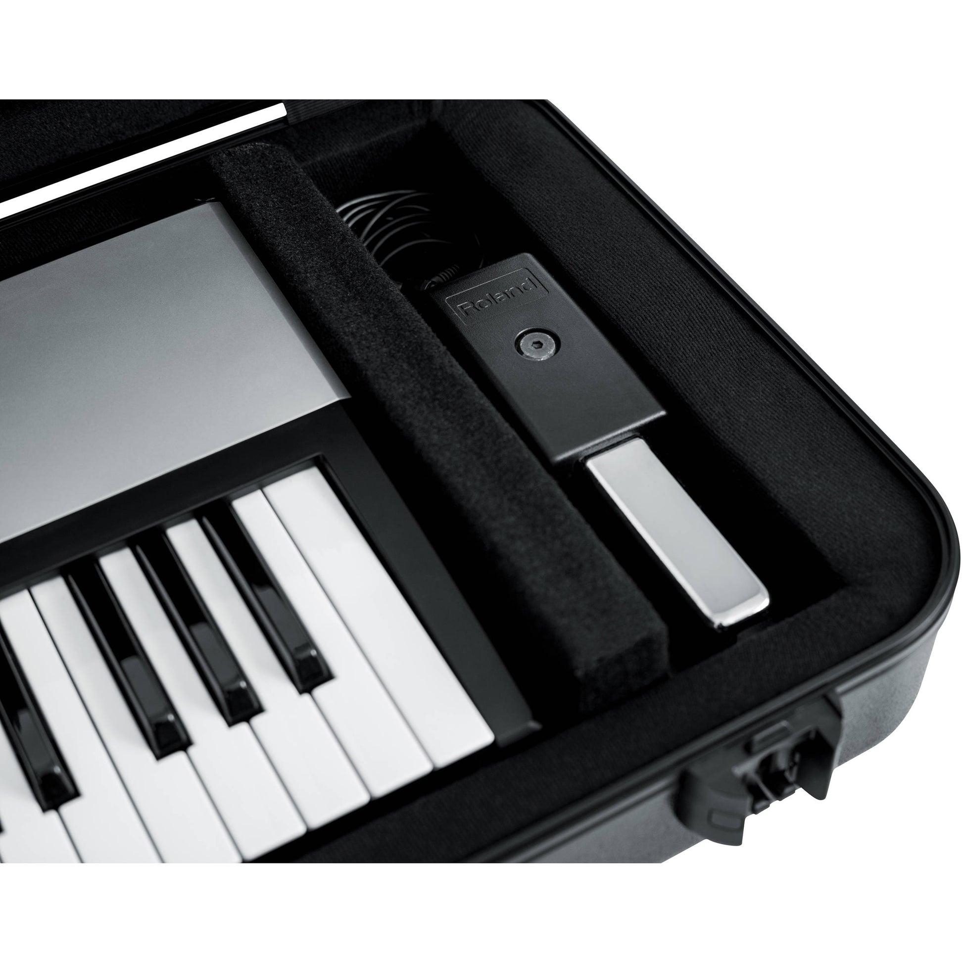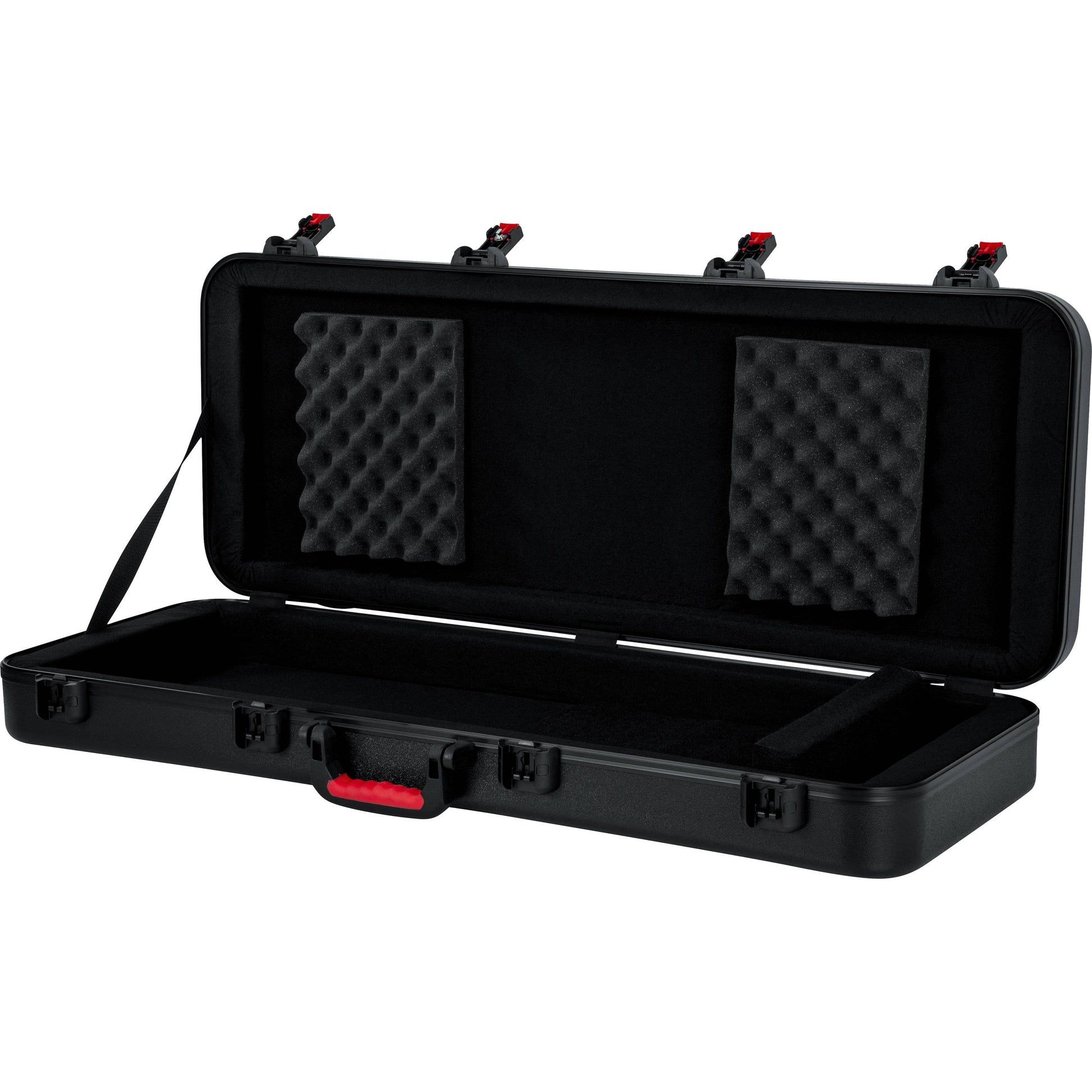 The interior of the case has a customizable wedge & block system which securely holds the keyboard in place during transit. The adjustable wedges also allow excess space to be used for storing your cables, foot switch, and other accessories. Heavy-duty and durable, this case is built out of nearly-indestructible polyethylene plastic with black powder-coated hardware and a continuous valance that gives extra rigidity by spreading the support evenly around the perimeter of the case. An ergonomic rubber-gripped top handle and an additional spring-loaded rubber grip side handle provide convenient carry and tow options.