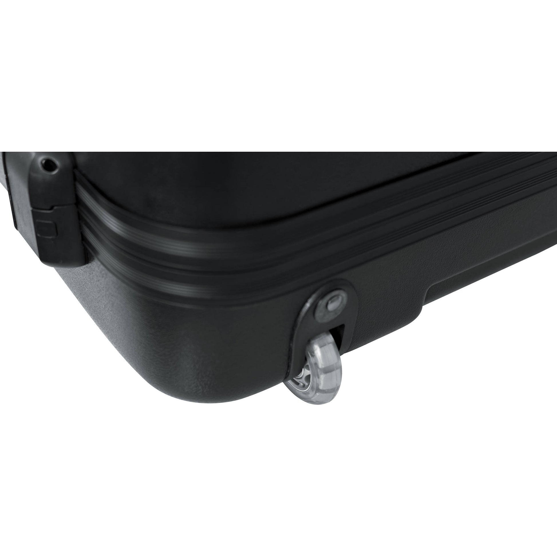 The interior of the case has a customizable wedge & block system which securely holds the keyboard in place during transit. The adjustable wedges also allow excess space to be used for storing your cables, foot switch, and other accessories. Heavy-duty and durable, this case is built out of nearly-indestructible polyethylene plastic with black powder-coated hardware and a continuous valance that gives extra rigidity by spreading the support evenly around the perimeter of the case. Recessed in-line wheels, an ergonomic rubber-gripped top handle, and an additional spring-loaded rubber grip side handle provide convenient carry and tow options.