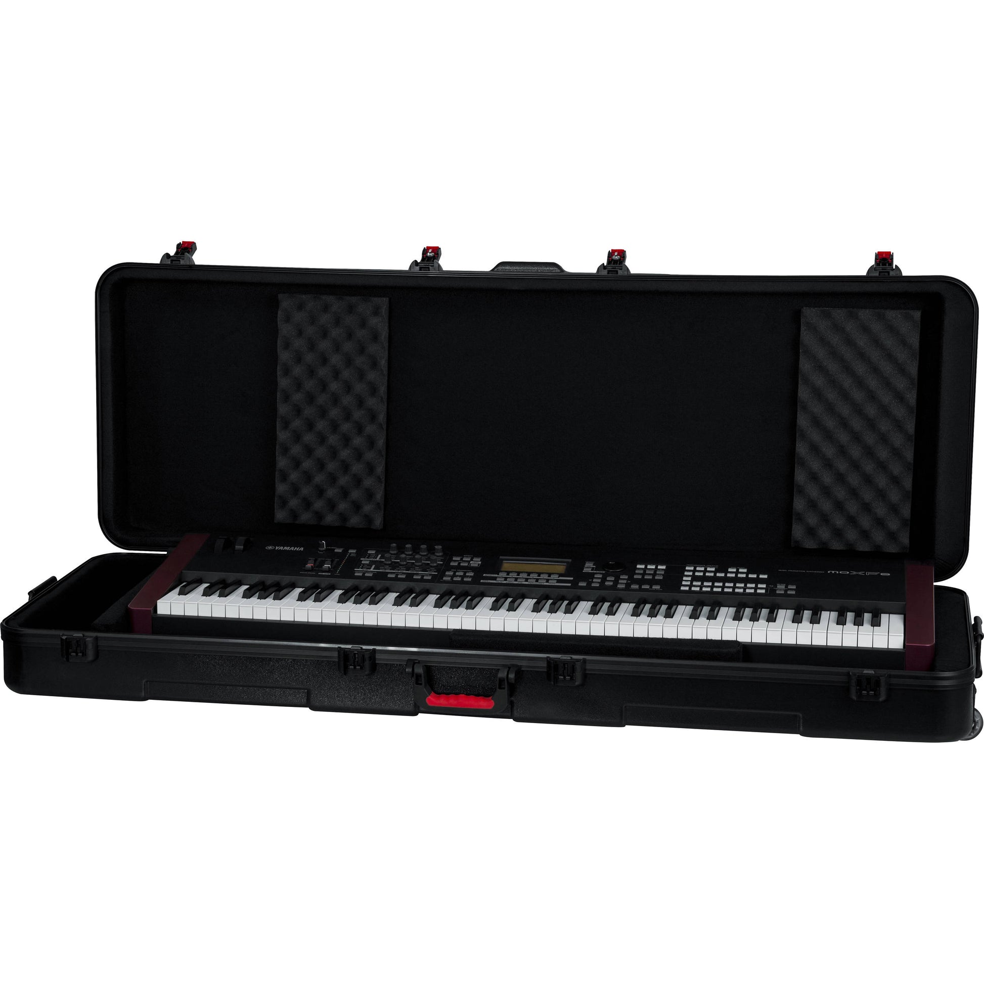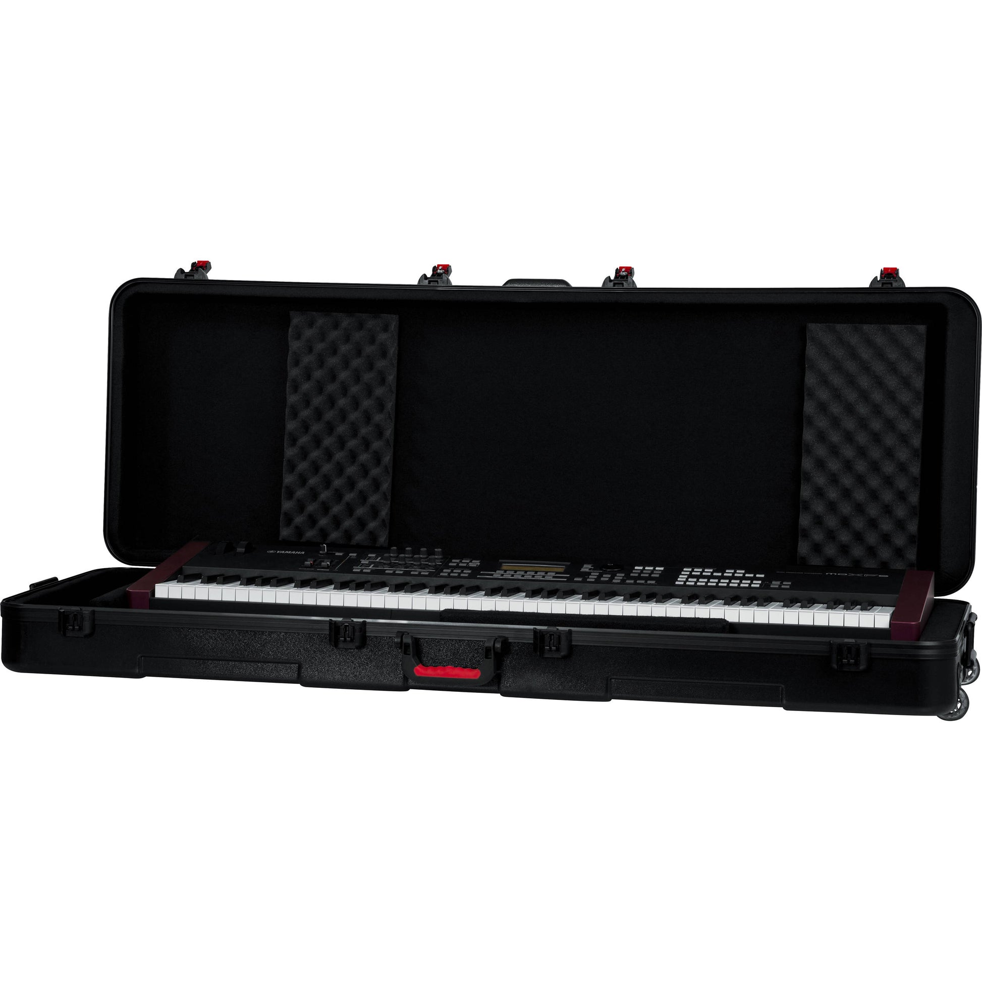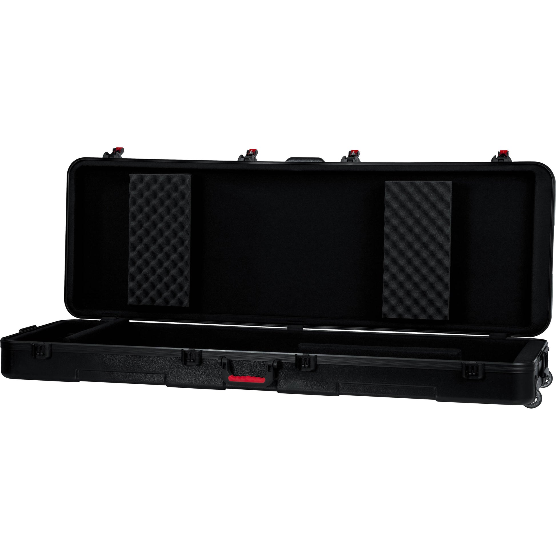 The interior of the case has a customizable wedge & block system which securely holds the keyboard in place during transit. The adjustable wedges also allow excess space to be used for storing your cables, foot switch, and other accessories. Heavy-duty and durable, this case is built out of nearly-indestructible polyethylene plastic with black powder-coated hardware and a continuous valance that gives extra rigidity by spreading the support evenly around the perimeter of the case. Recessed in-line wheels and an ergonomic rubber-gripped top handle make for easy handling, and two additional spring-loaded rubber grip side handles allow for two-man carry configurations.