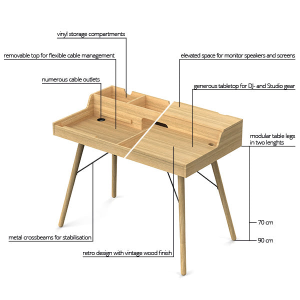 The Vintage Music Station is an innovative hybrid combination of DJ table and studio workstation in a trendy retro look, which is suitable for many creative applications. Adaptive table legs in 2 different lengths allow the table height to be varied so that it can be ergonomically adjusted for mixing as well as for studio work.