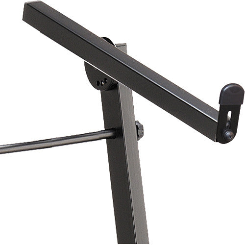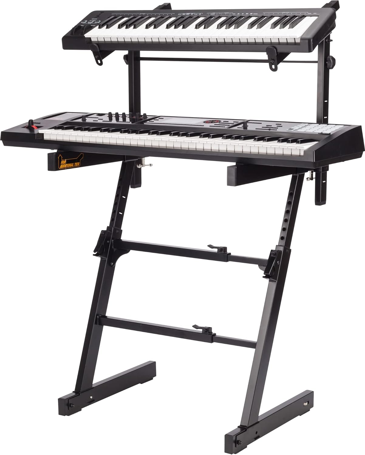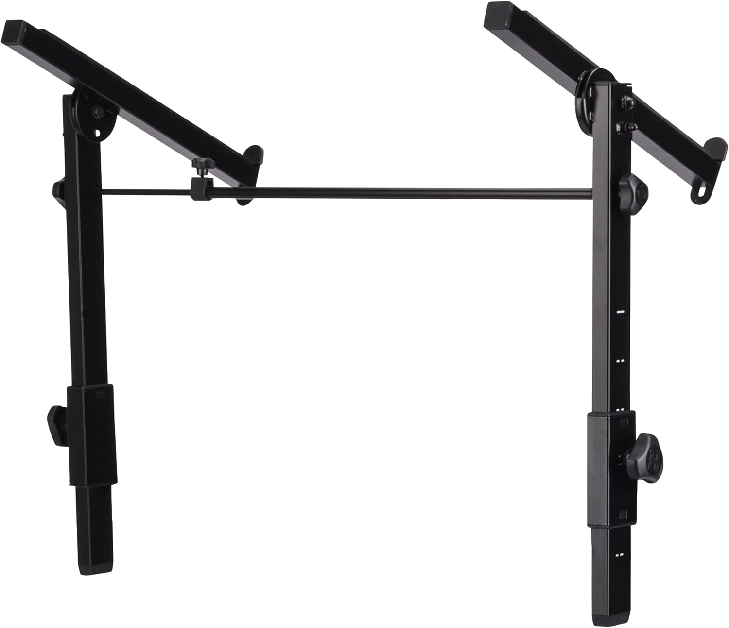The EZ-Lok system on the upper tier allows you to lock it at either 70° or 90° for optimum playing comfort. Featuring the Auto Lock Lever system, the stand allows you to adjust its height simply by lifting or lowering the stand's arms. Once you put the arms where you want them, the stand locks automatically at the selected height without adjusting any knobs, greatly simplifying setup. The adjustable rubber foot helps you to level the stand and fine-tune its height, while locking pins and adjustable moving arms ensure easy setup and take-down. For convenient transport and storage, the stand quickly folds down into a compact bundle.
