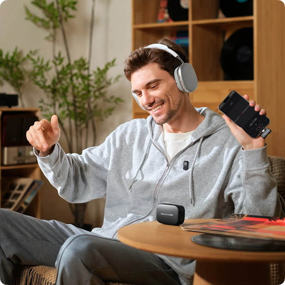 Works seamlessly with iOS devices via Lightning port. Pairable with Android/USB-C devices using other receiver variants. App control via LarkSound for EQ and reverb settings.