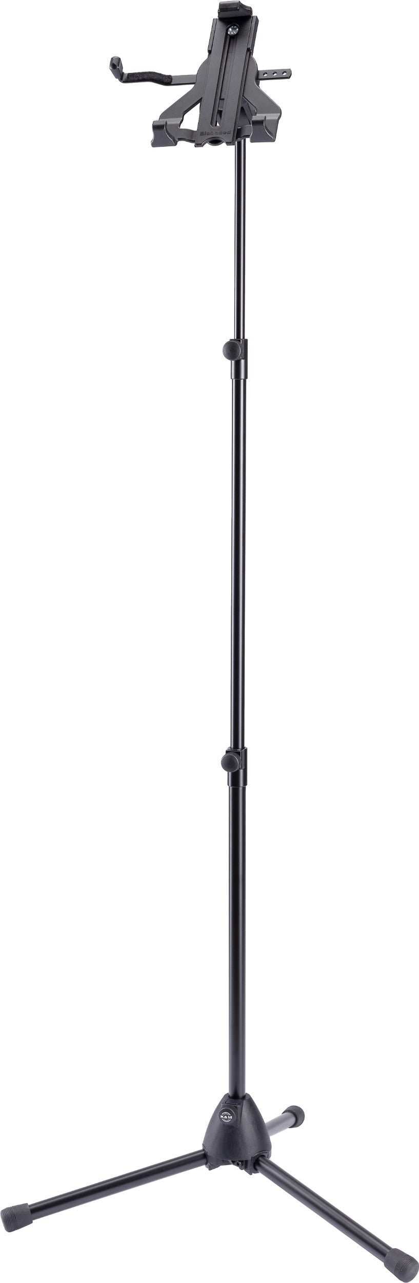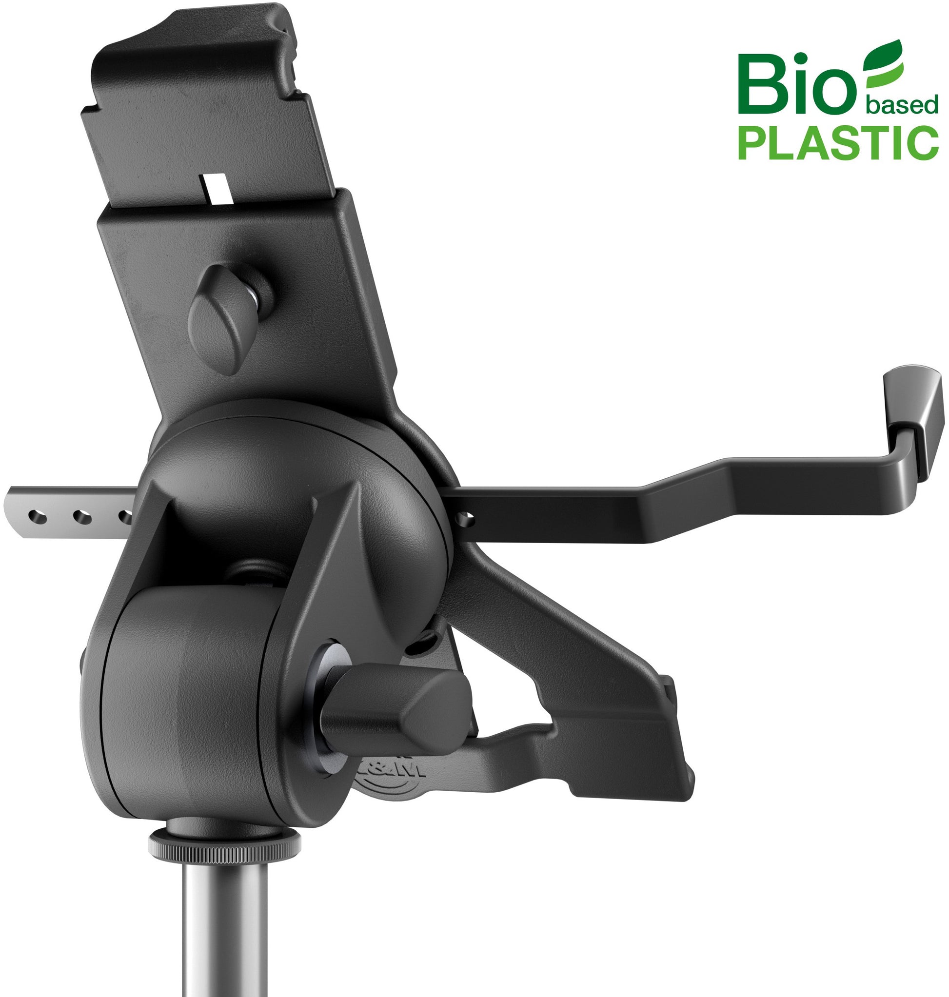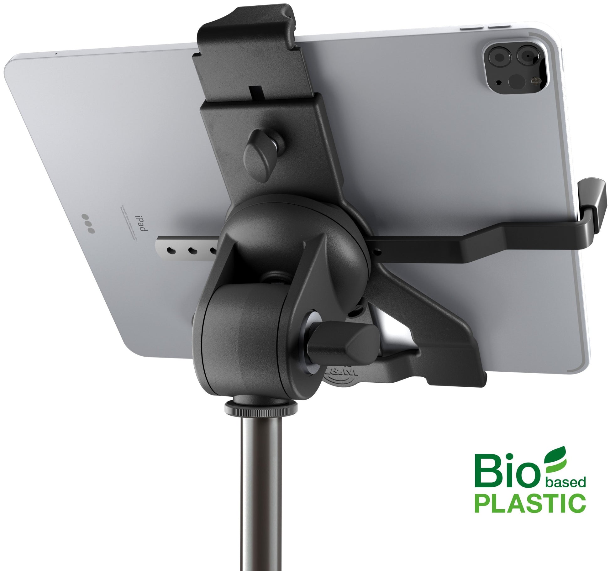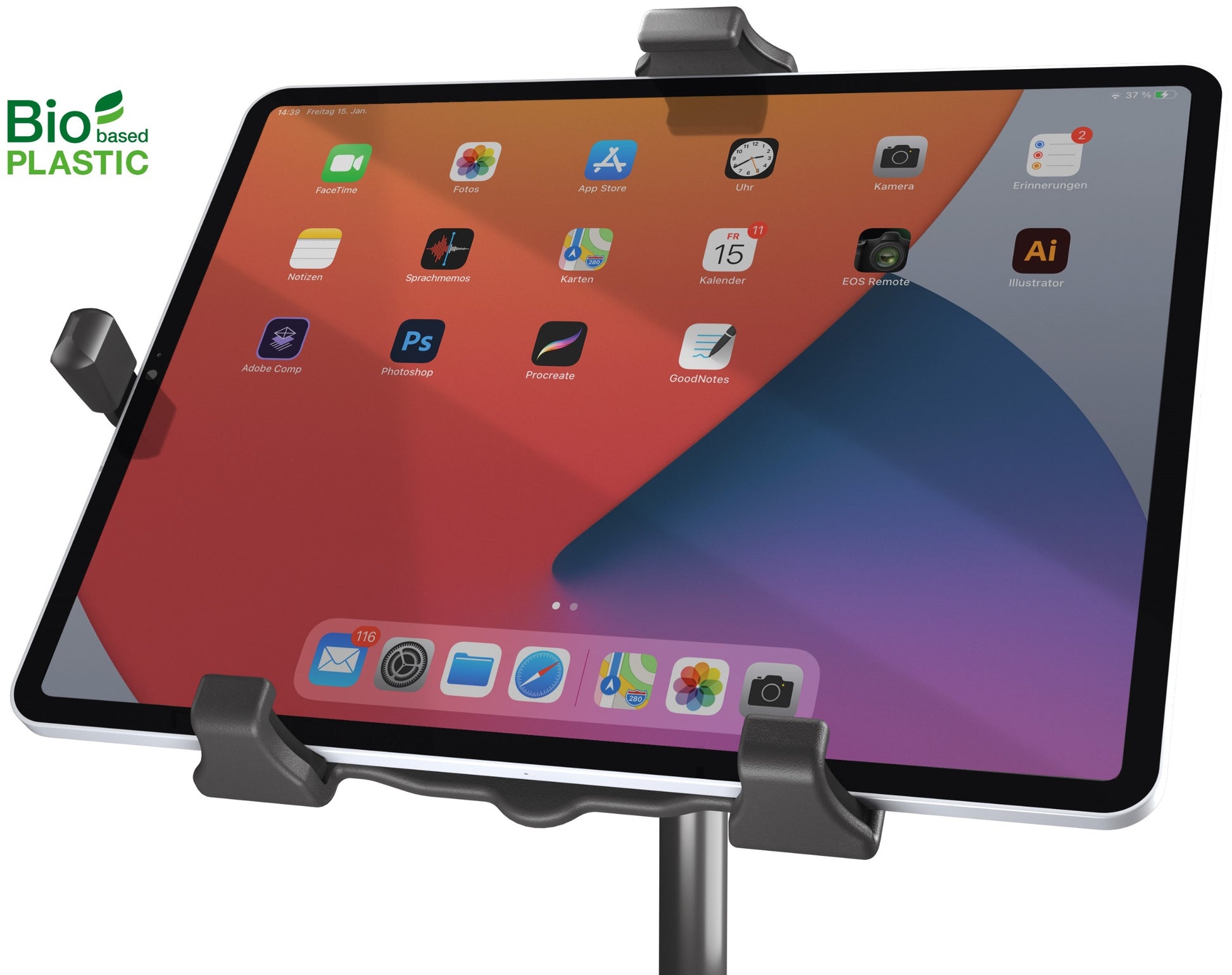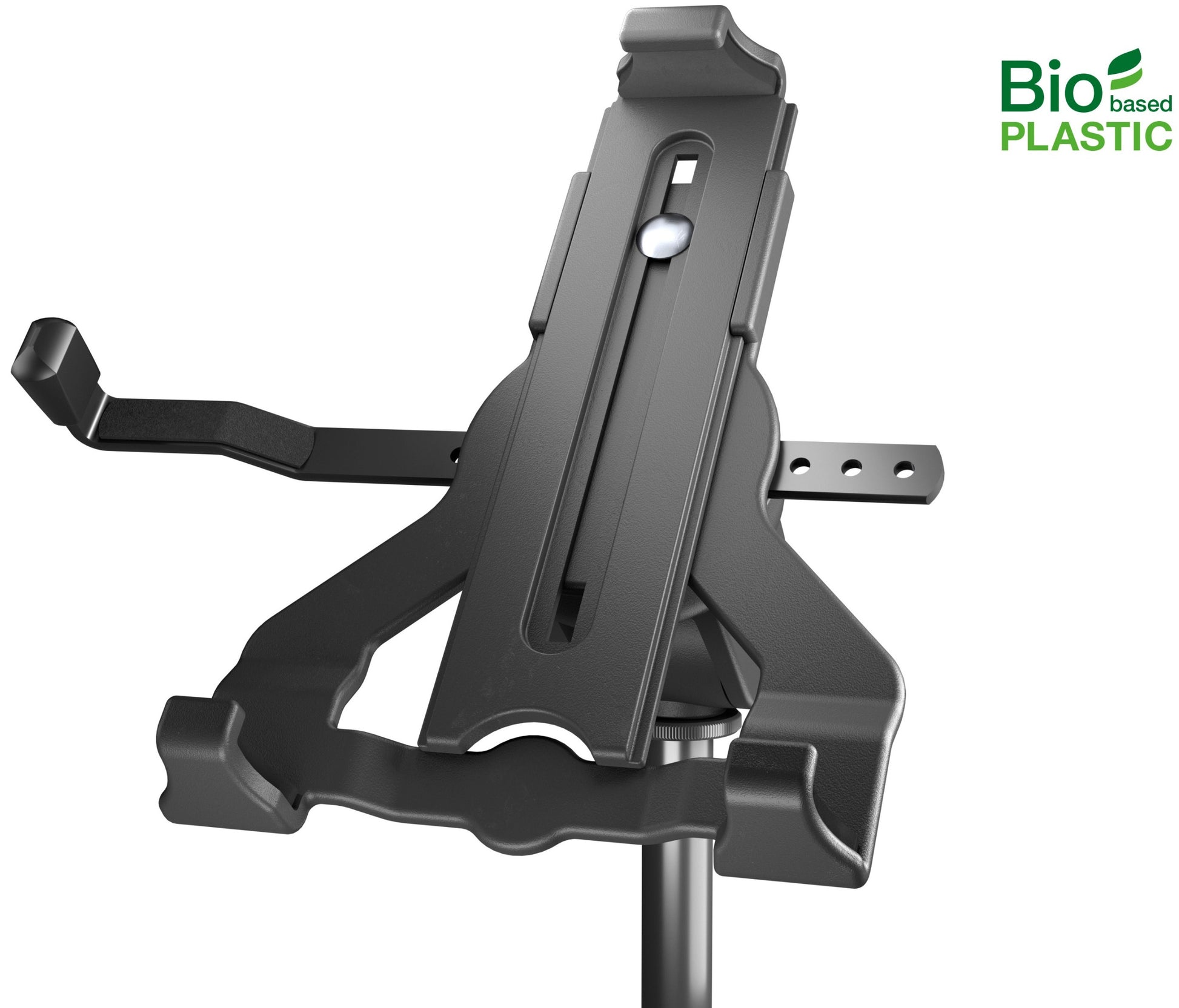 The tablet mount is made of bio-based plastic. These plastics contain a proportion of over 50% up to 100% of renewable plant-based raw materials. The use of renewable raw materials helps to conserve limited petroleum resources and reduce harmful CO2 emissions. The stand can be folded in a space saving manner for easy transport. The universal tablet holder offers a practical clamping mechanism for all tablets with an approx. size of 10" to 16". The clamping range is between 15.8 and 28 cm. The holder is also particularly suited for tablets with a protective cover or case up to 1.8 cm thickness. The overlapping clamping jaws with integrated rubber pads guarantee a secure hold and eliminate unwanted vibration noise. The function of the operating elements on the device is not impaired. An adjustable mounting bracket with felt padding provides additional safety when the tablet holder is positioned vertically, preventing the tablet PC from falling out even under heavy use. The holder is infinitely adjustable and allows each user to position it individually. The tablet holder can be rotated between portrait and landscape format without further ado, whereby independent turning is prevented.