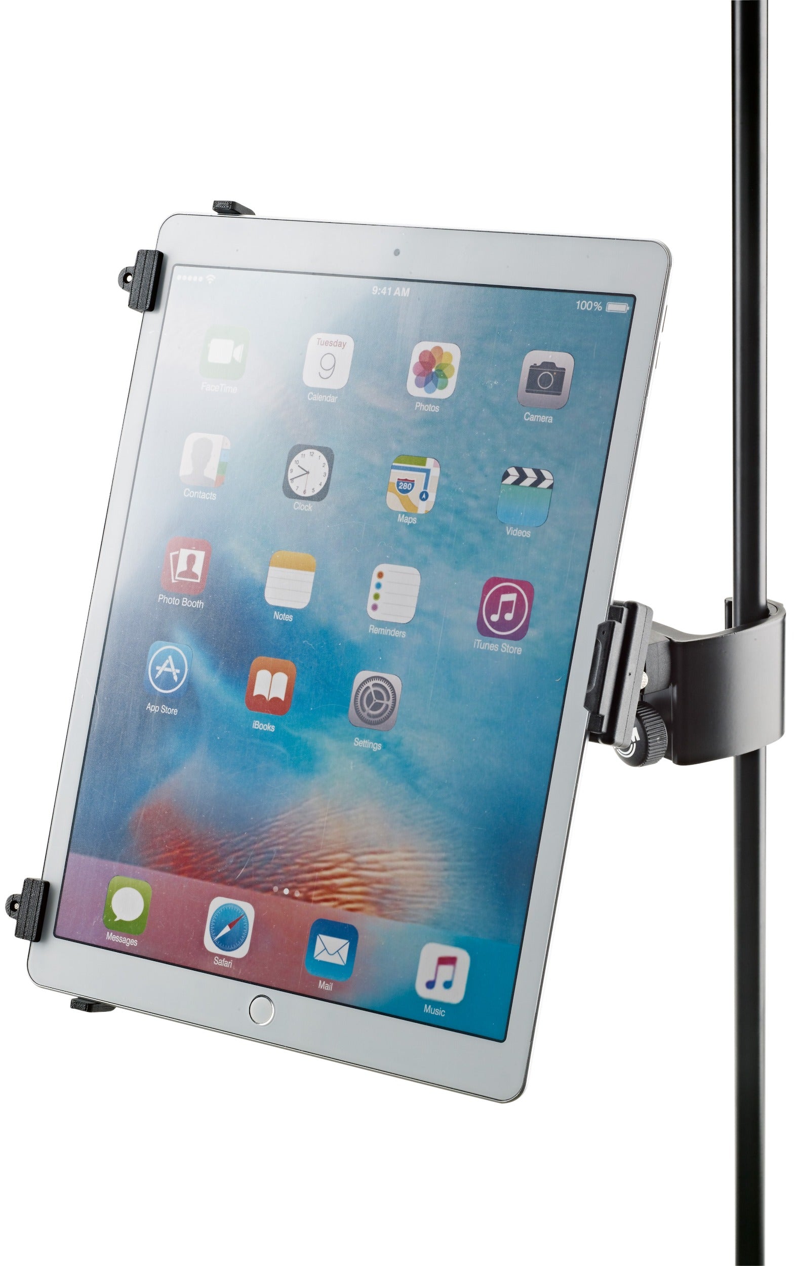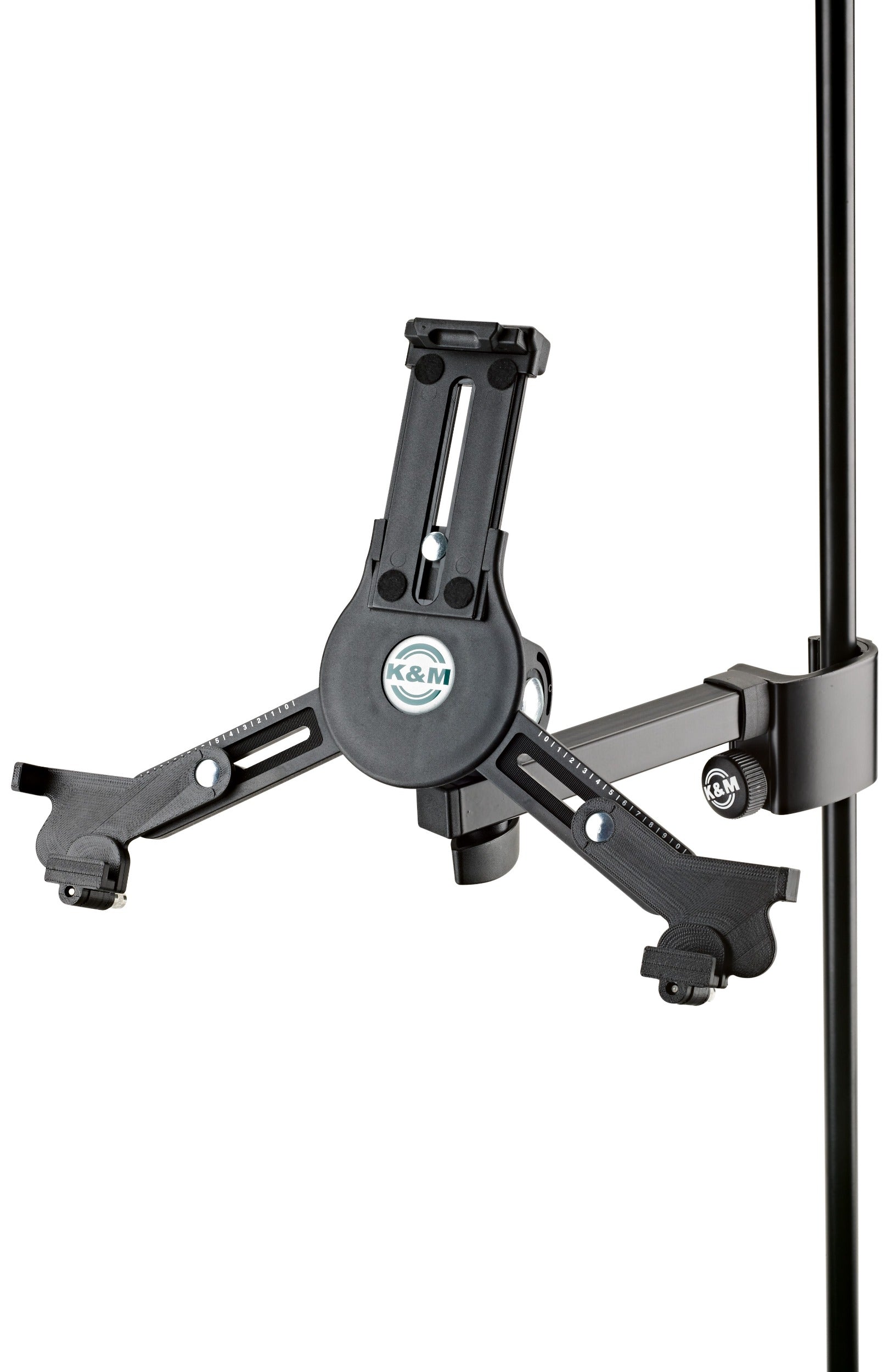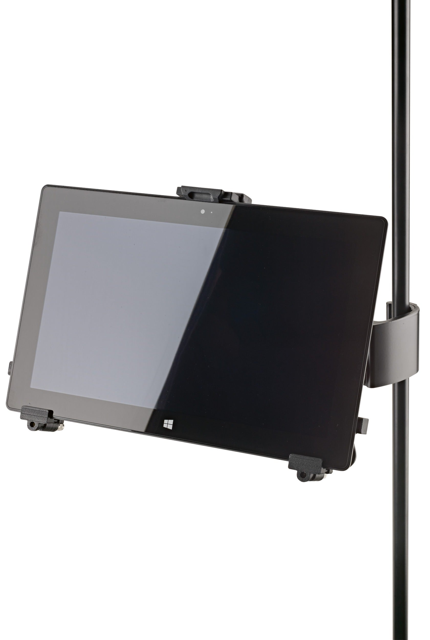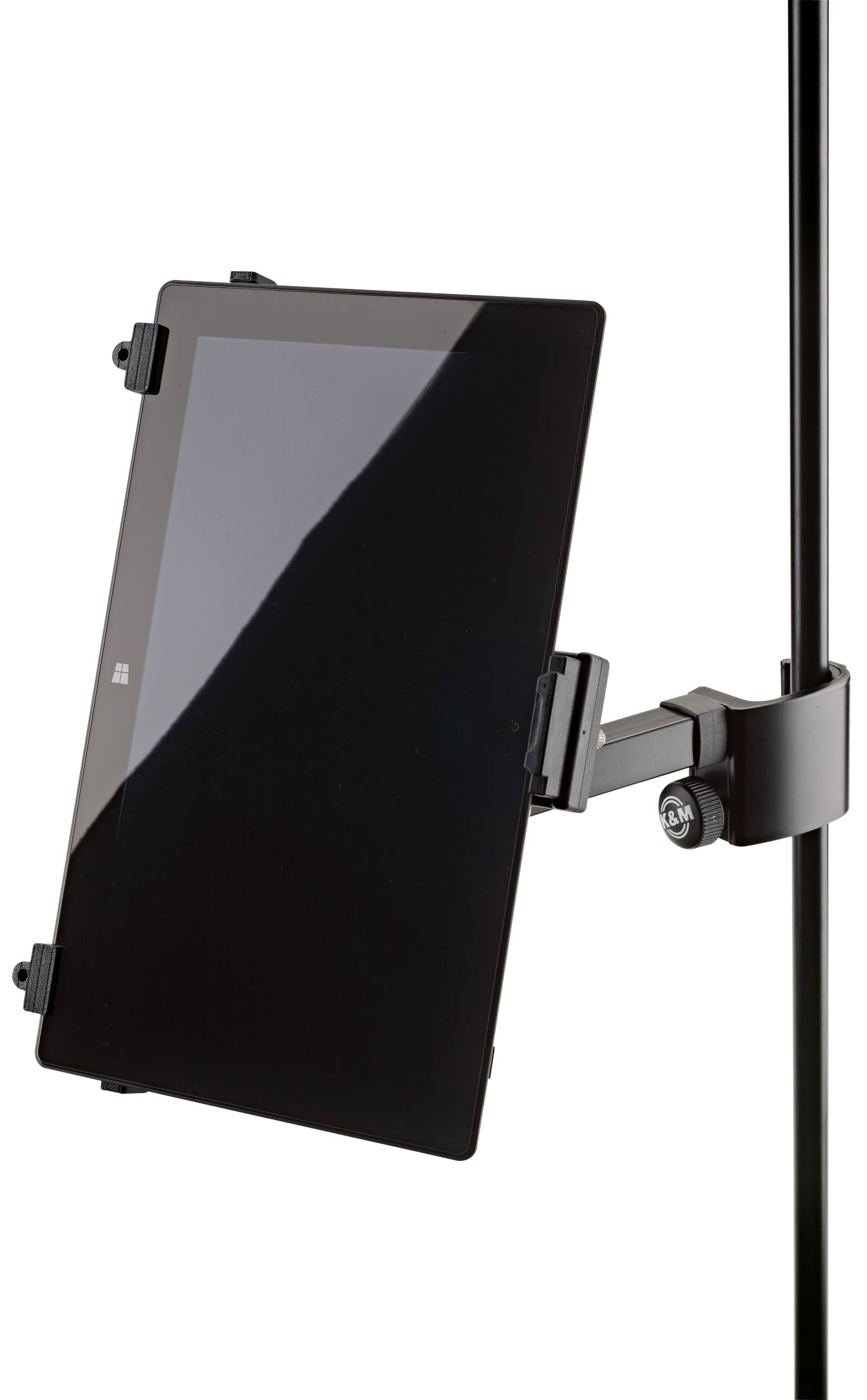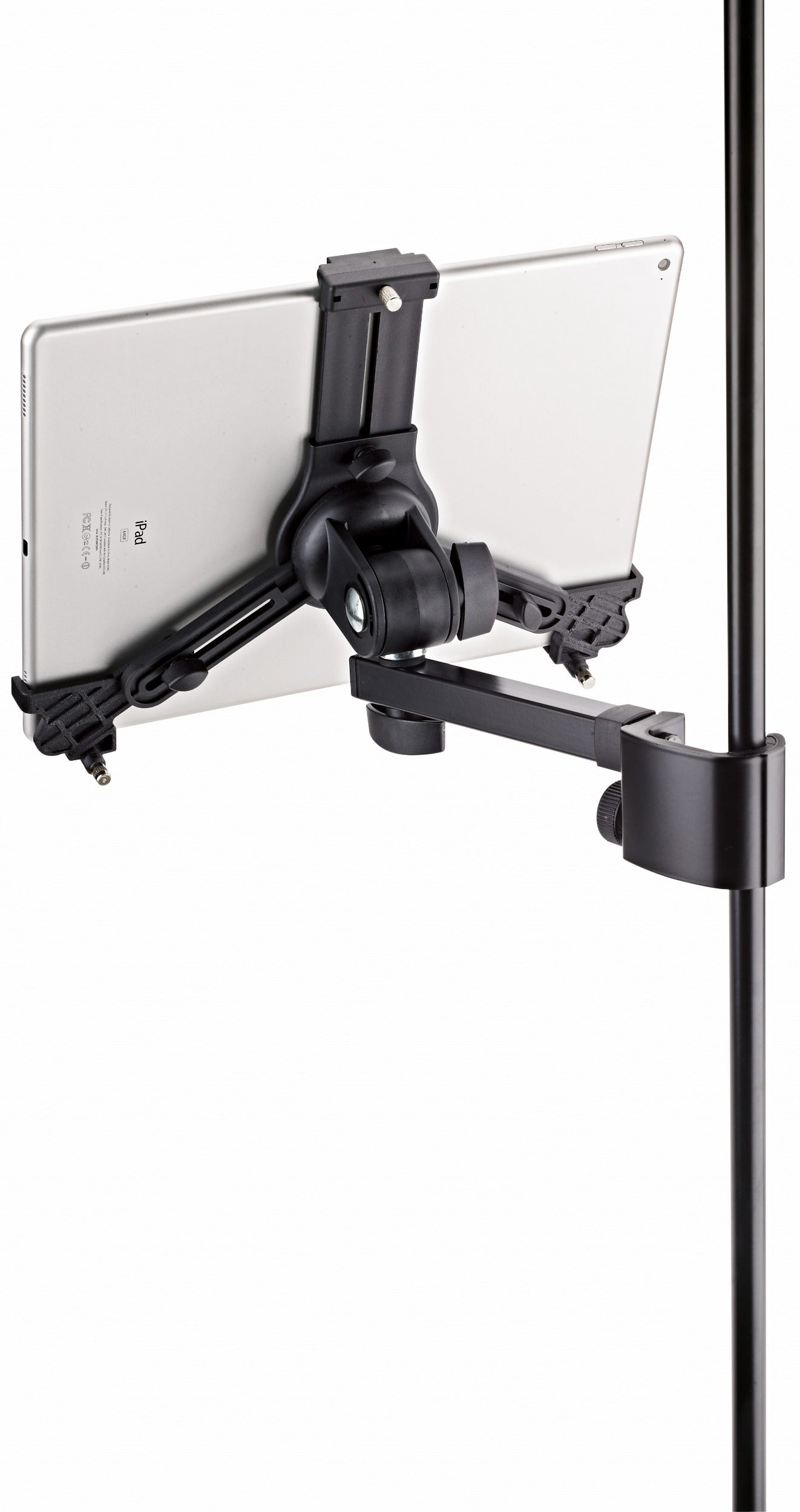 Be it on stage, in rehearsal rooms or at home - thanks to the strong clamp element with the ergonomic clamp screw the holder can be attached to any tube up to 3 cm quickly and easily. The individually adjustable support arms can accommodate the use of tablets ranging in height from 22.2 to 33.4 cm and width from 12.8 to 23.2 cm (for example iPad, iPad Air, iPad Pro, Amazon Fire HDX 8.9, Samsung Galaxy Tab from 9.7, Google Nexus 9, Asus Transformer or Microsoft Surface as well as Surface Pro). The depth of the tablets can vary between 0.6 and 1.1 cm. For the first use of the tablet holder the support arms settings are made by adjusting the clamp screws to the size and depth of the tablet. For other uses the tablet can be attached and detached quickly and simply through a snap lock. A handy wing nut allows one to adjust the angle, so that each user will easily be able to find their ideal individual position. The tablet can switch between portrait and landscape positions. The tablet is kept in place, there is no danger of the tablet switching position by itself.