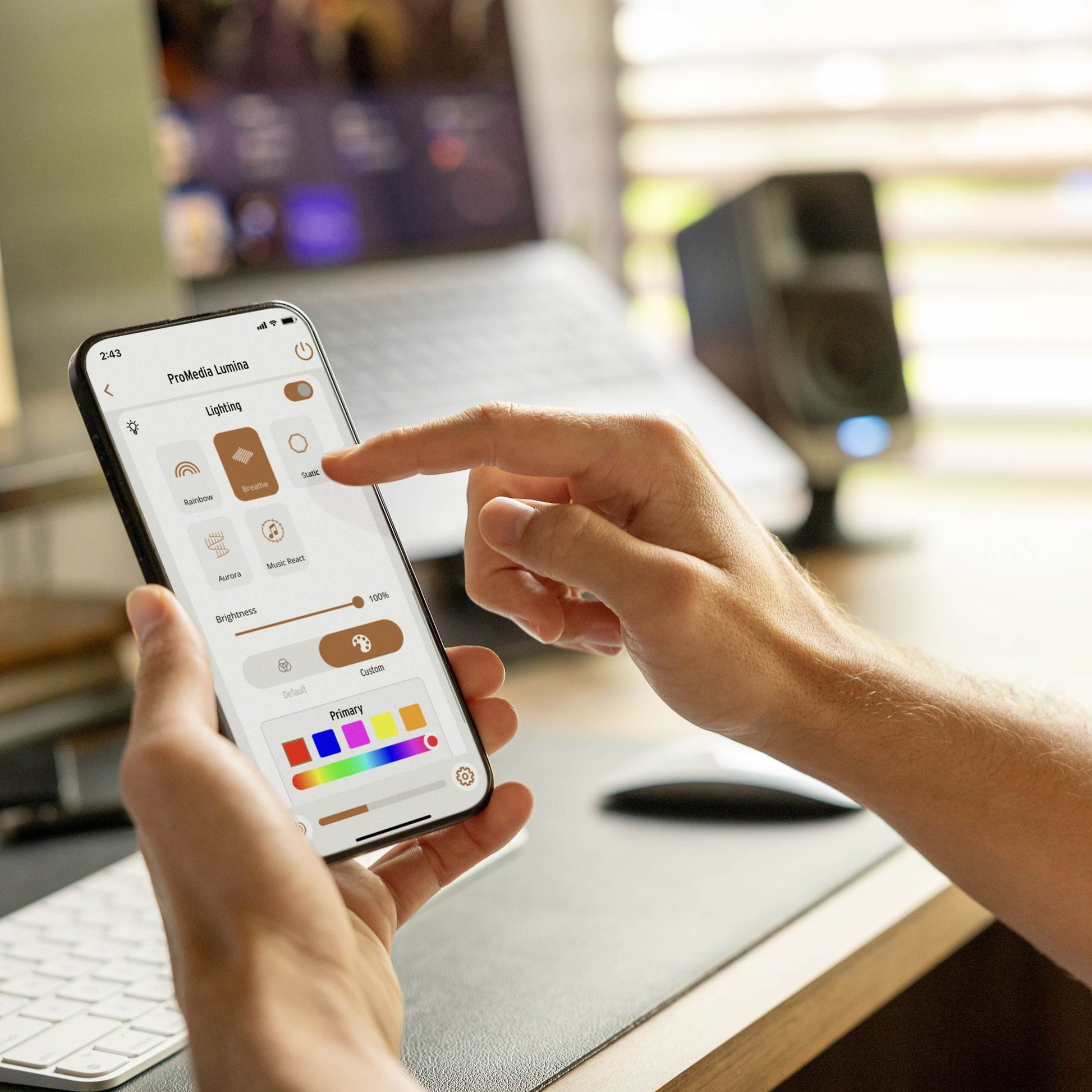 ProMedia Lumina gives you a compact, stylish 2.1 system that can handle gaming, content creation, music and movies with ease. The horn-loaded satellites keep dialogue and detail clear, the slim sub adds real low-end impact without stealing floor space, and the apps let you fine-tune both sound and lighting to match your workflow or play session—all from your desktop or phone.