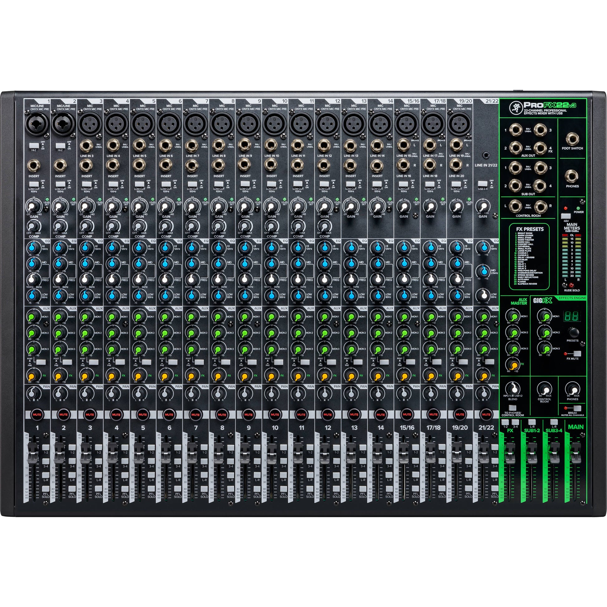 Channels 1-2 offer combo XLR-1/4" mic/line connections and a Hi-Z switch (for guitar and bass), while channels 3-20 offer XLR or 1/4" inputs. Channels 1-12 provide single-knob compressors, while channels 1-14 include inserts. Channels 15/16, 17/18, and 19/20 offer two 1/4" line inputs each (L and R for stereo), while channel 21/22 uses a 3.5mm stereo input. Channels 1-22 feature gain controls, a 3-band EQ, three aux sends for monitors, a dedicated FX send, pan, mute, and level faders. Engaging channel 21/22's USB 3-4 switch will override the 3.5mm input and enable the USB return from a computer.