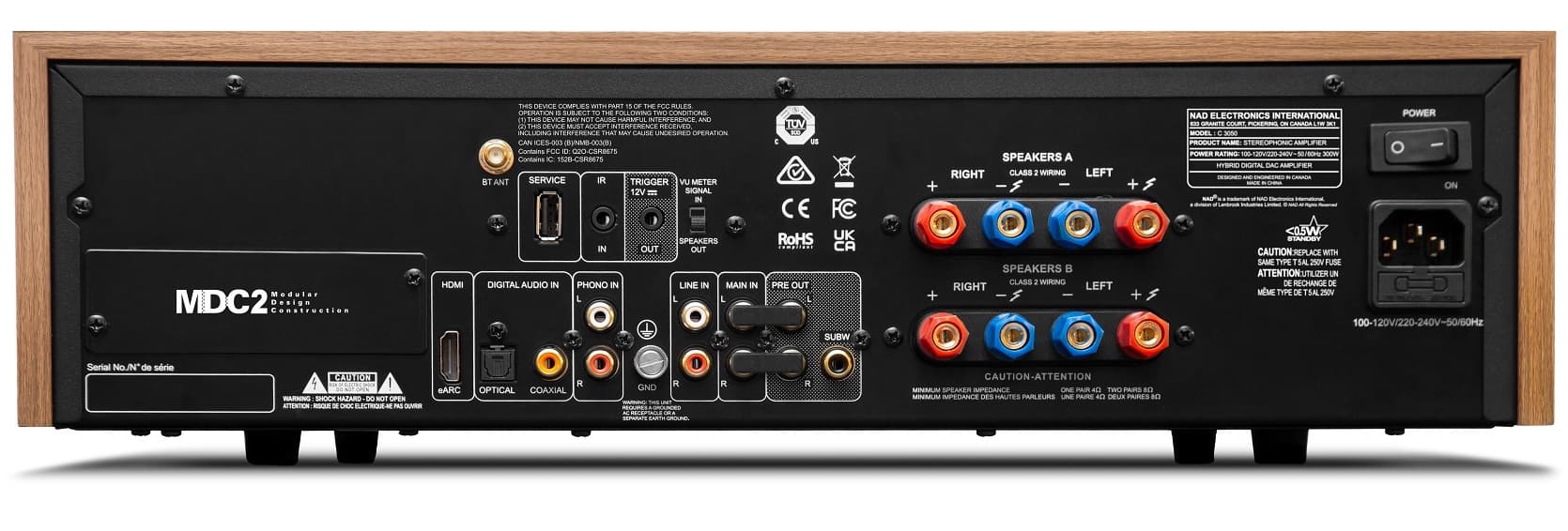 - Vintage-inspired design: Includes retro VU meters, walnut-clad chassis, dark grey panel, and original cursive NAD logo.