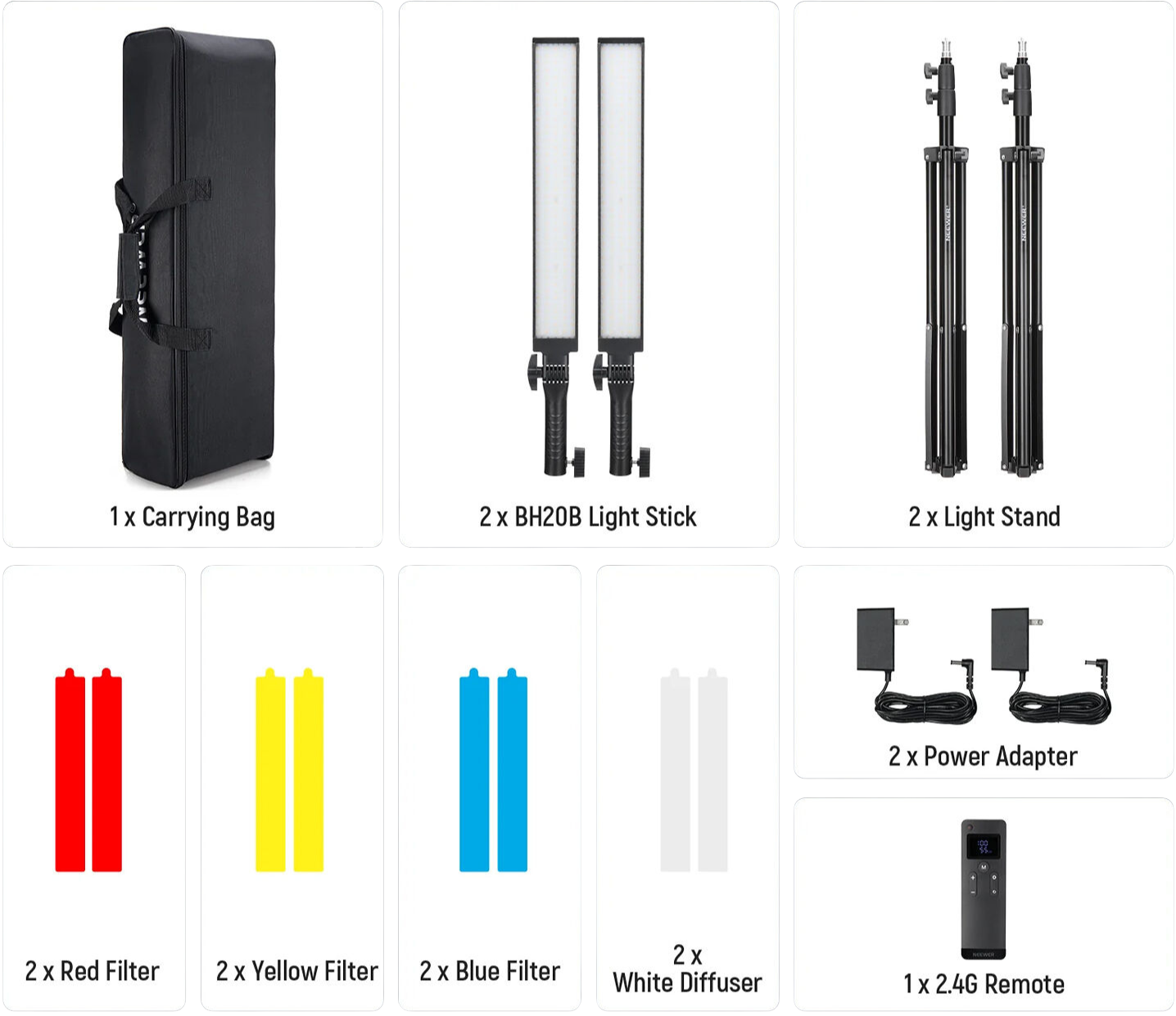 Neewer BH20B – Remote Bi-Color LED Light Stick Kit with Filters and Stands
