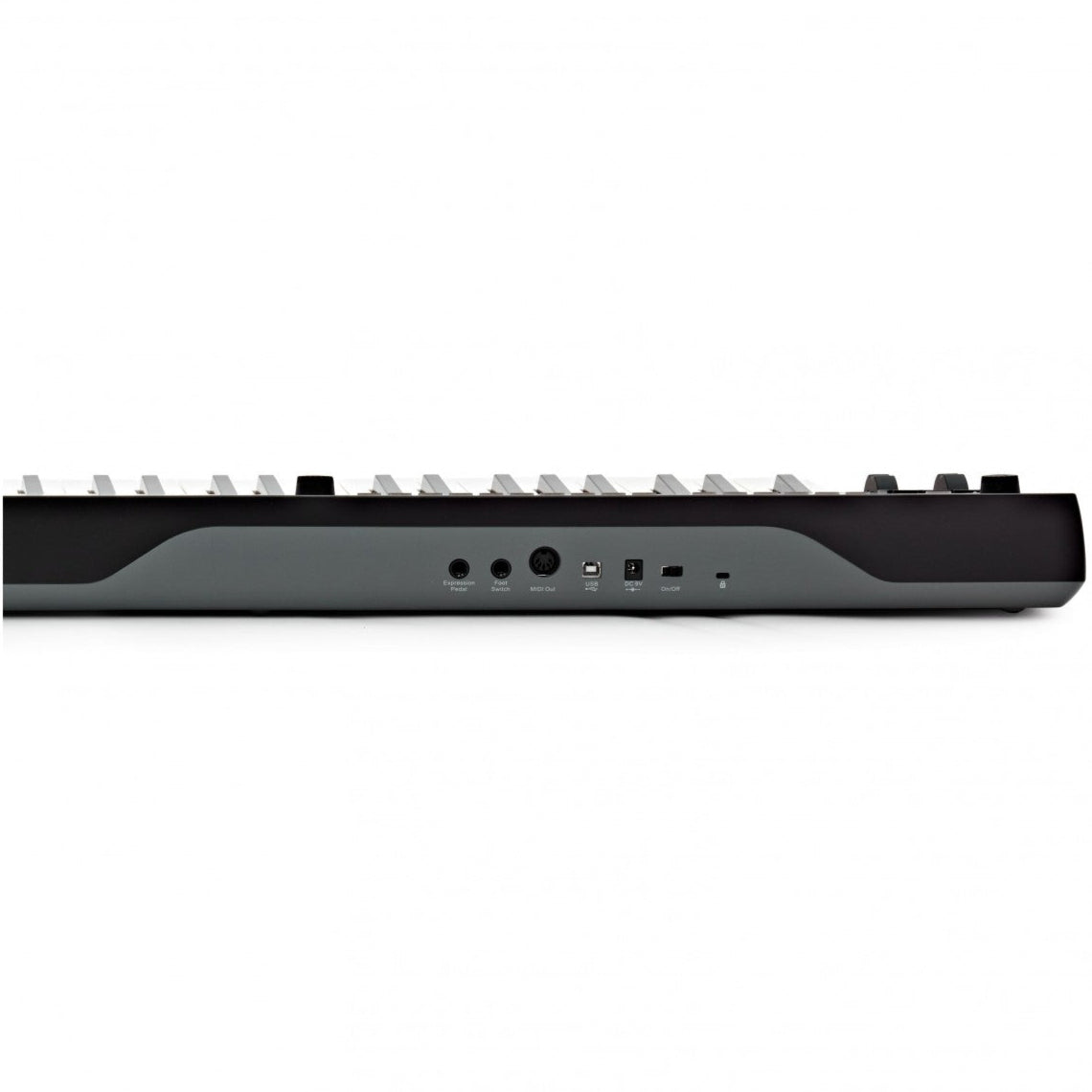 - Performance Controls: Pitch-bend and modulation wheels, octave and transpose buttons with LED feedback, expression pedal and dual footswitch jacks, and a 5-pin MIDI output for hardware studios.
