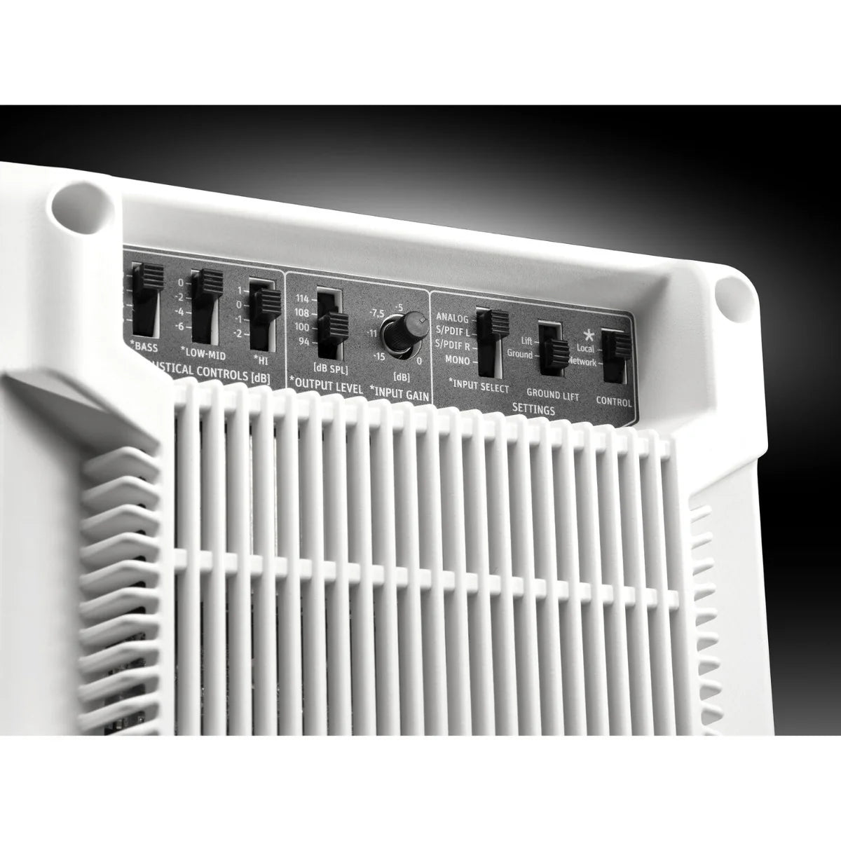 - Controls: Acoustic EQ, input gain, level, analog/S/PDIF input selection, local/network mode switch