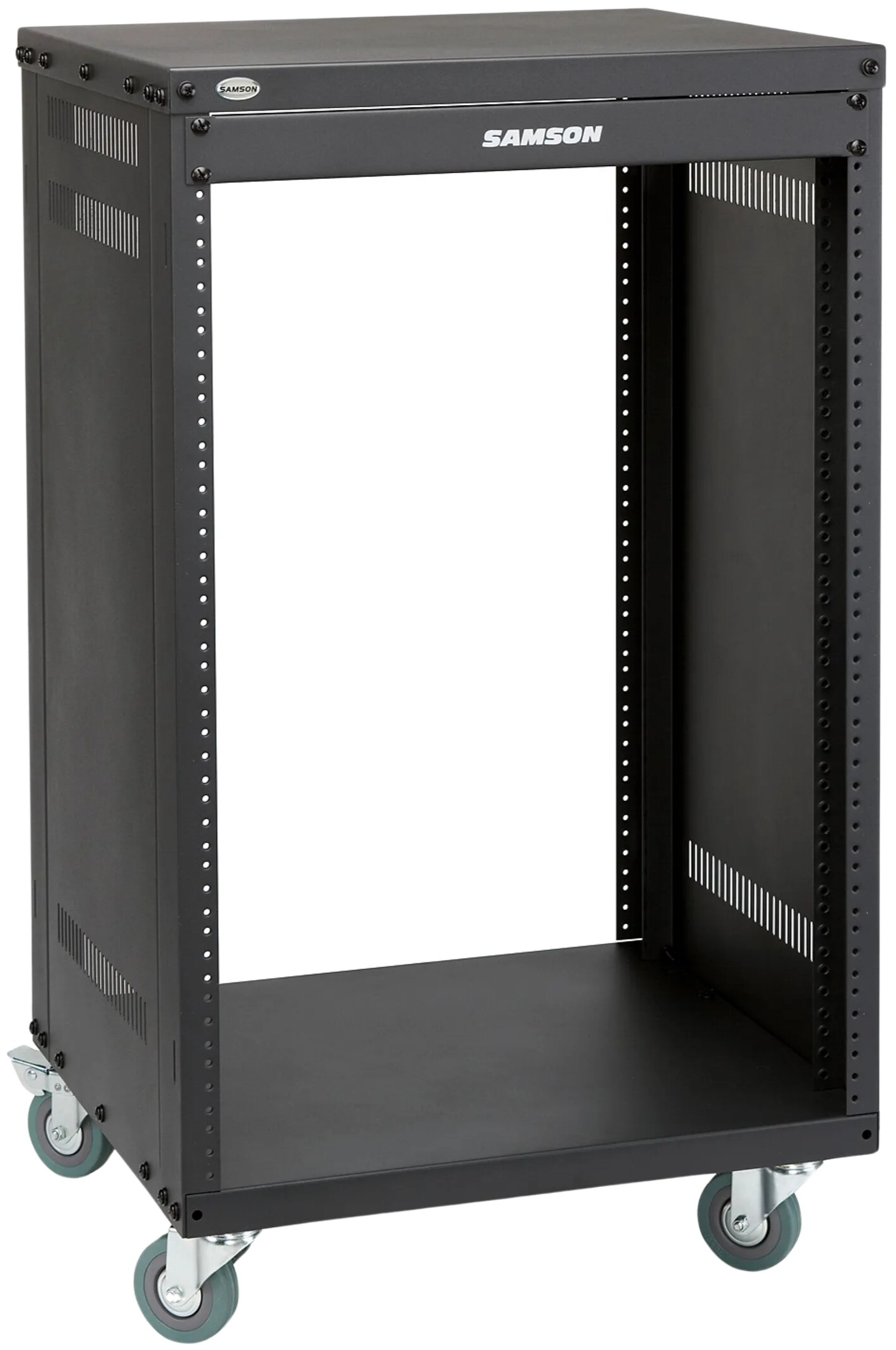 The Samson Universal Rack Stand SRK16 is a rugged, steel universal rack stand featuring fully enclosed side panels. It stands on (4) heavy-duty, 7.5 cm casters with locking fronts, making movement of the cabinet a breeze. It was designed for 48 cm equipment and offers 16U of space. Included with the rack is a single-space, flanged blank panel. Its unique steel support-bar construction also allows this rack to be used with either European or U.S. thread sizes.