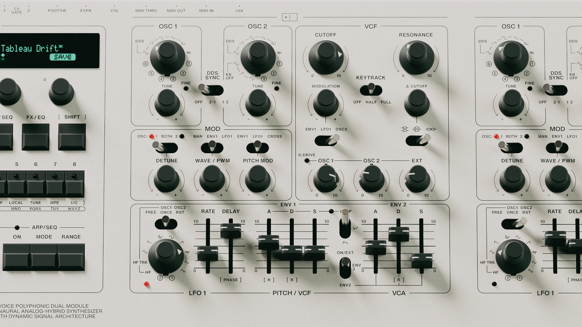 - 2-part multitimbral design: Two fully independent hybrid synthesizers, each with dedicated panel controls for instant hands-on operation.