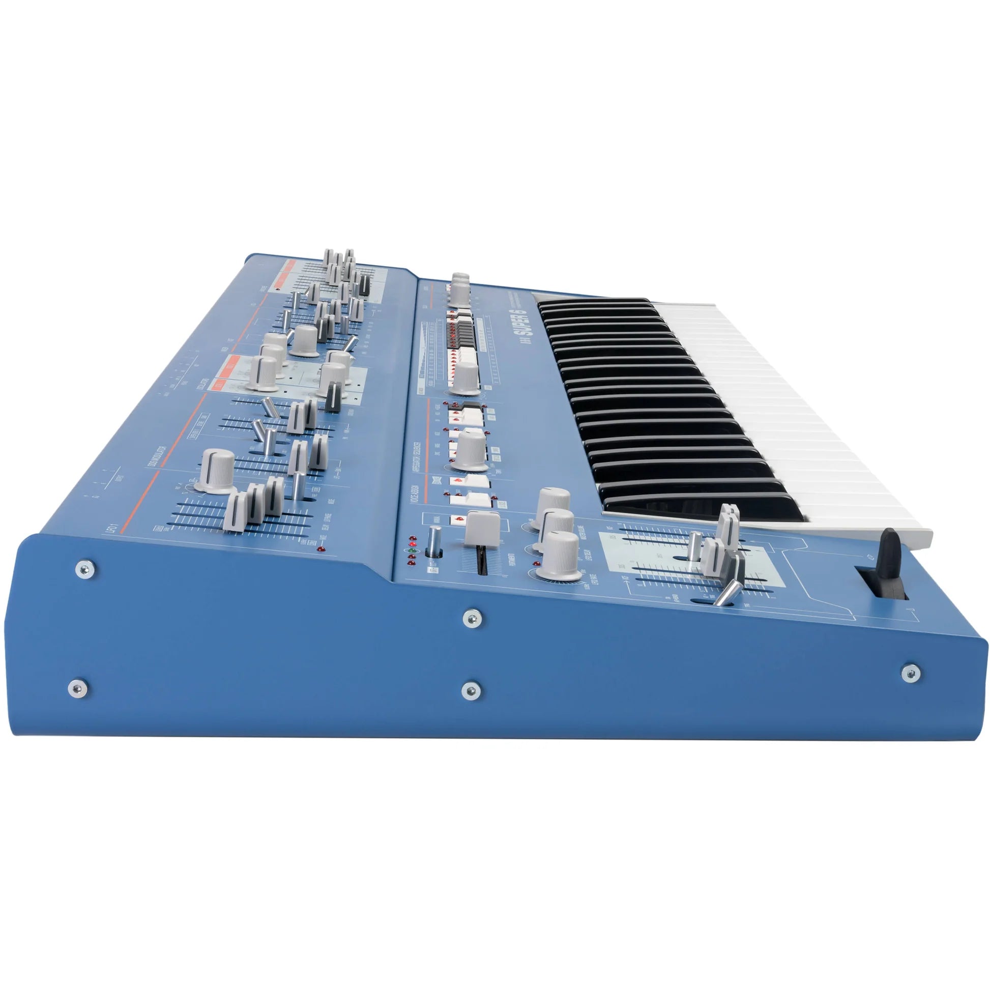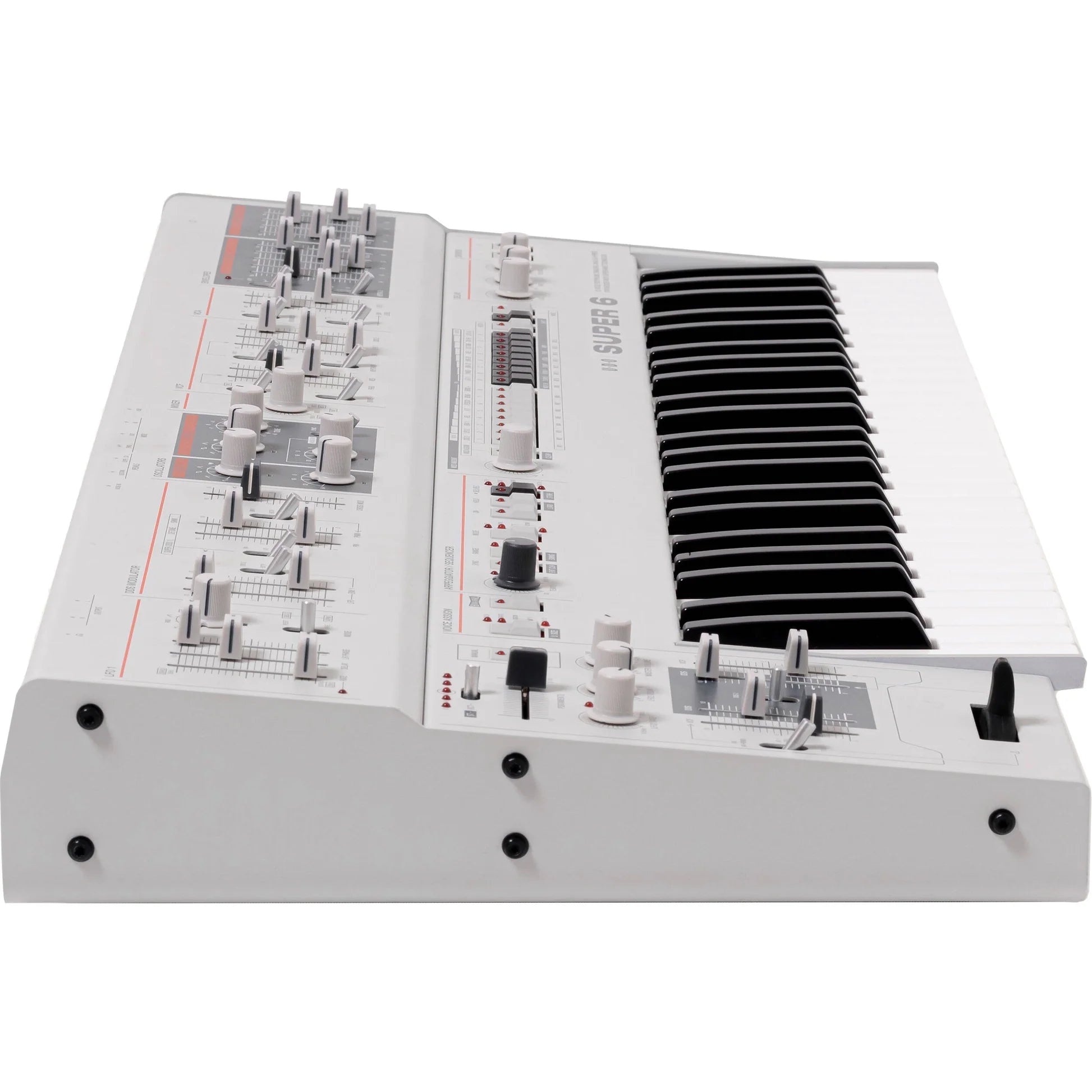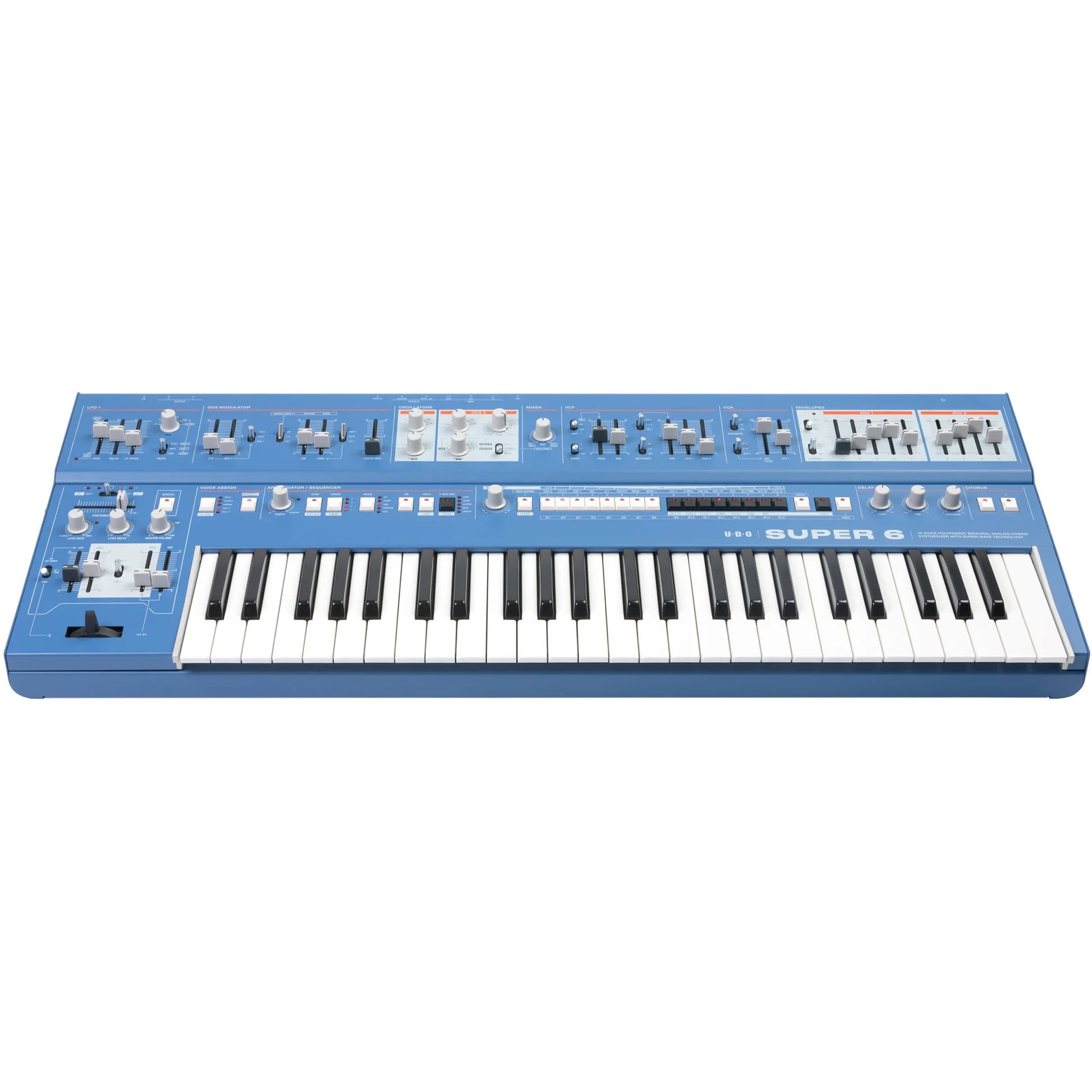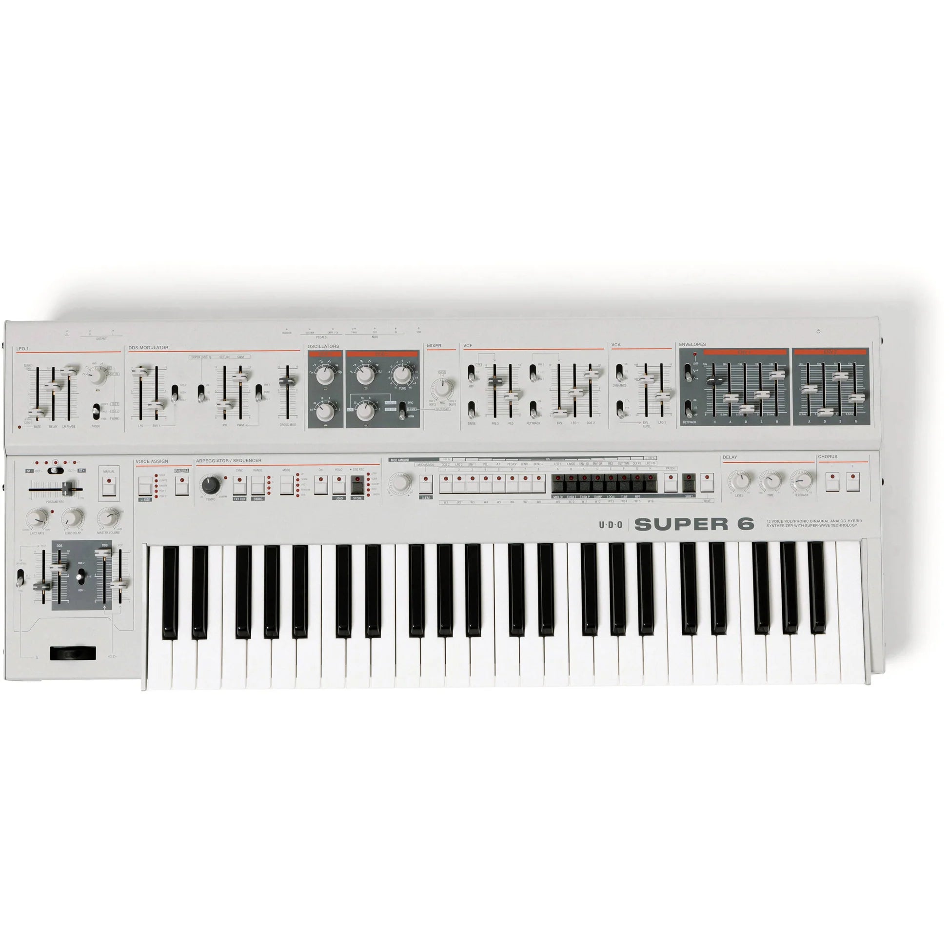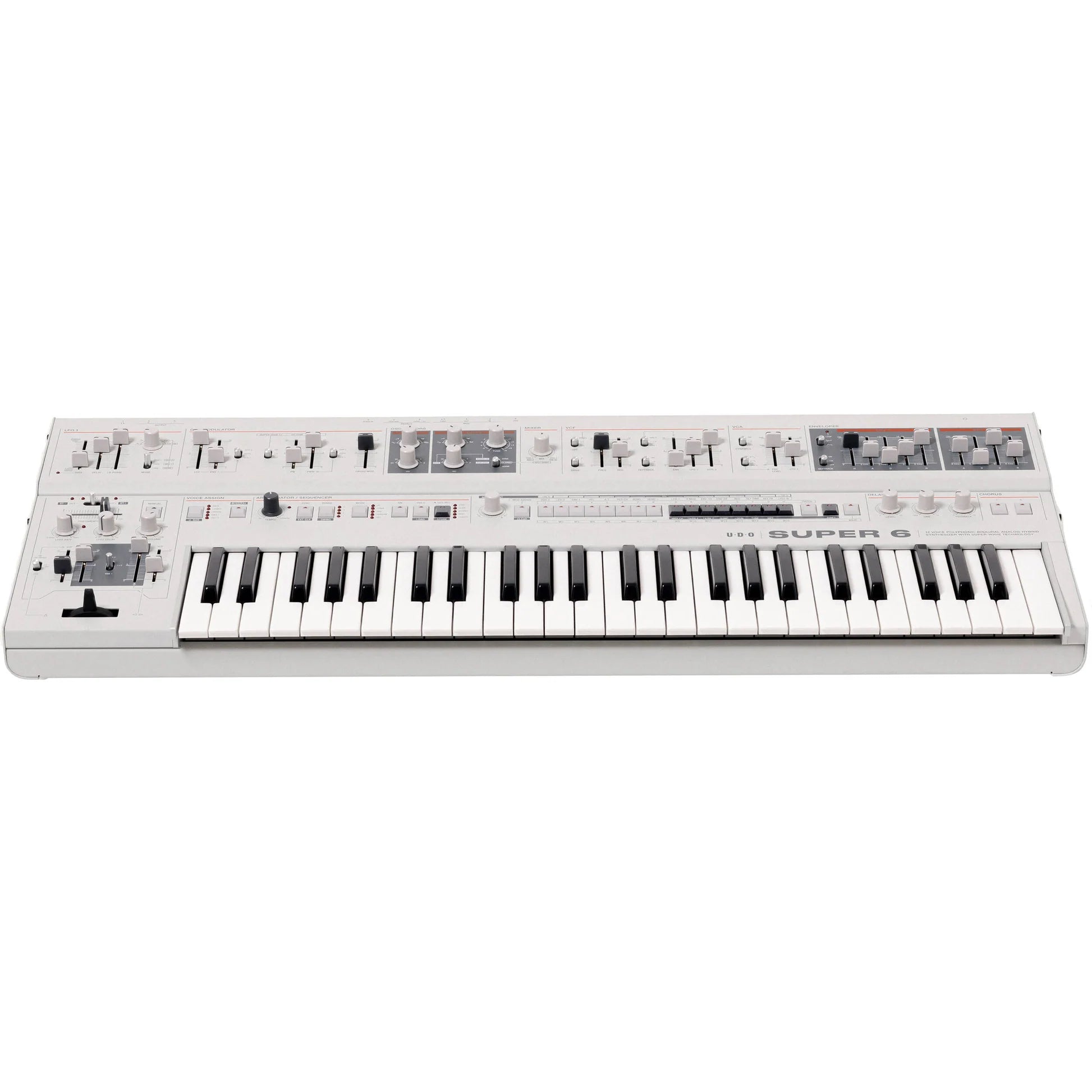 Featuring an expressive 49-key Fatar keyboard with velocity and polyphonic aftertouch, the black Super 6 Synthesizer from UDO Audio is a polyphonic, 12-voice digital-analog hybrid synth with two digital FPGA-based oscillators per voice fed into a real analog SSM2044-inspired VCF with a resonant 4-pole LPF and fixed linkable HPF, a fully analog VCA with selectable velocity sensitivity, and two highly versatile envelope generators. The Super 6 synthesizer can support binaural output for true-stereo audio with massive spatial potential, allowing you to create uniquely immersive and dynamic sounds with the benefits of analog warmth and digital precision.