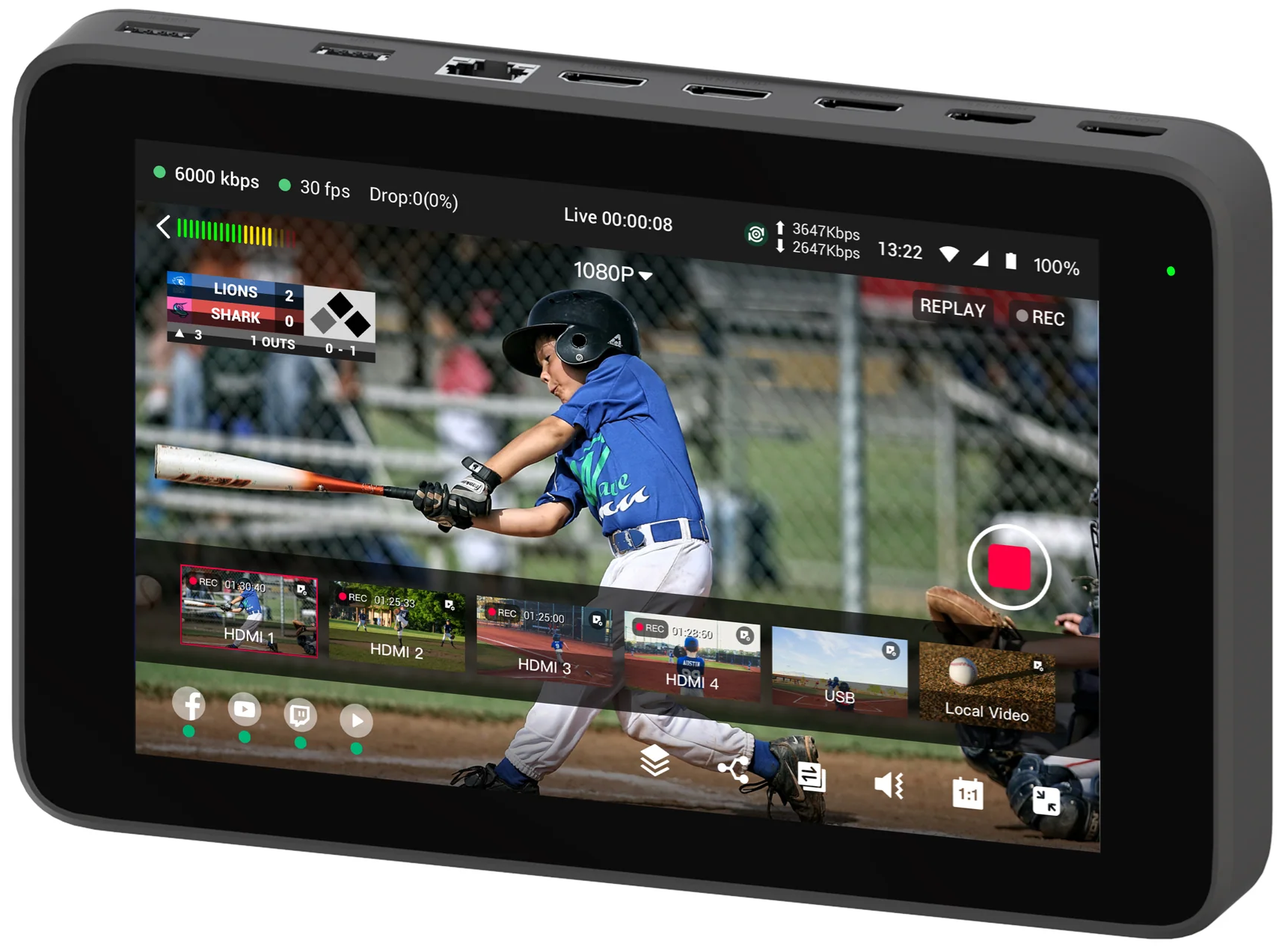Create a live stream production from anywhere with the YoloBox Ultra from YoloLiv, which functions as a portable multicamera encoder, streamer, switcher, monitor, and recorder all in one device. Broadcast simultaneous UHD 4K video streams via Wi-Fi 6, RJ45 Ethernet, USB-C modem, or 4G LTE with a SIM card and subscription. The Ultra features four HDMI, one USB-C, and two USB-A inputs to connect to multiple cameras or devices. An integrated Qualcomm CPU 865 improves live streaming performance and a 650 cd/m² brightness LCD touchscreen improves visibility. The Ultra can stream for up to 8 hours at a time thanks to the built-in 6800mAh battery.