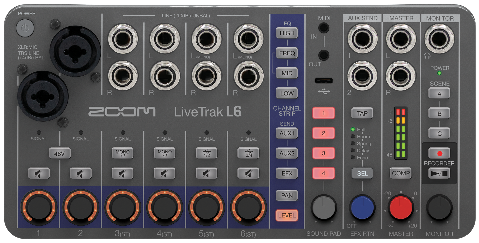The Zoom LiveTrak L-6 is a highly capable pocket-sized mixer/recorder that delivers full multitrack and live mixing power wherever creativity strikes. It’s perfect for on-the-go musicians, streamers, and sound explorers.