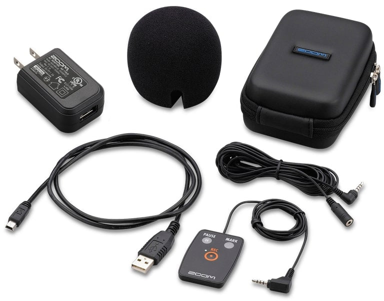 The package includes a padded-shell case for easy carrying, a remote control (RC2) for various operations such as REC, PLAY, STOP, etc., a foam windscreen to prevent wind and breath blowing, an AC adapter for long hours of use without worrying about the remaining battery power, and a USB cable for use as a USB microphone for PC, Mac, and iPhone/iPad*.