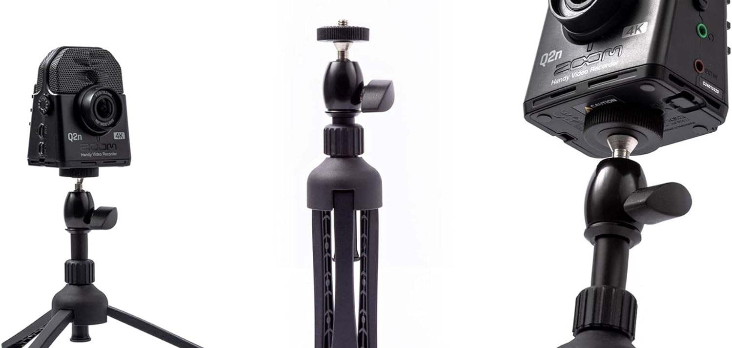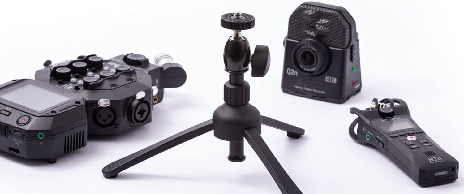 The Zoom TPS-5 is a lightweight tripod stand designed for portable recorders like the Q2n-4K, H2n, and H4n Pro. With a swivel ball head, rubber feet, and foldable legs that double as a handgrip, it offers stable support and flexible positioning for audio and video devices—available with Soundium.